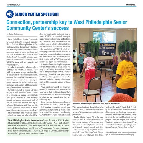 Connection, partnership key to West Philadelphia Senior Community Center’s success By Ralph Richardson West Philadelphia Senior Community Center (WPSCC) is located a couple blocks from the Philadelphia Zoo in the Parkside section. The expansive building that was designed to house a state-of-theart senior center is a real knockout and has been nicknamed the “Wow of West Philadelphia.” The neighborhood’s great sense of community is reflected inside WPSCC’s doors with an energetic and welcoming vibe. A cadre of active older adult members contribute to WPSCC’s success. “We pride ourselves on being a member-driven senior center,” said Rose Richardson, executive director of WPSCC. With more than 25 years of experience working in senior services, she leads a staff of eight employees and garners additional assistance from member volunteers. WPSCC restarted in-person activities on July 6 with members’ input. “Prior to re-opening, we created a specific task force [that consisted of] our advisory council and center members of each of the disciplines that we were thinking of offering,” Richardson said. “For us, this holistic approach really makes a difference. We empower our members to lead.” Many members and volunteers share Richardson’s vision of what should be