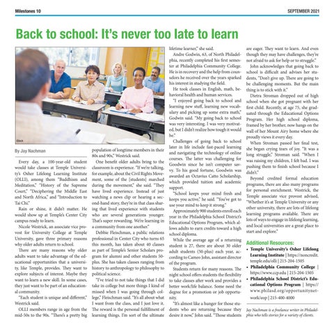 • Temple University’s Osher Lifelong Learning Institute | https://noncredit. temple.edu/olli | 215-204-1505 • Philadelphia Community College | https://www.ccp.edu | 215-204-1505 • Philadelphia School District’s Educational Options Program | https:// www.philasd.org/opportunitynetwork/eop | 215-400-4000 Jay Nachman is a freelance writer in Philadelphia who tells stories for a variety of clients.