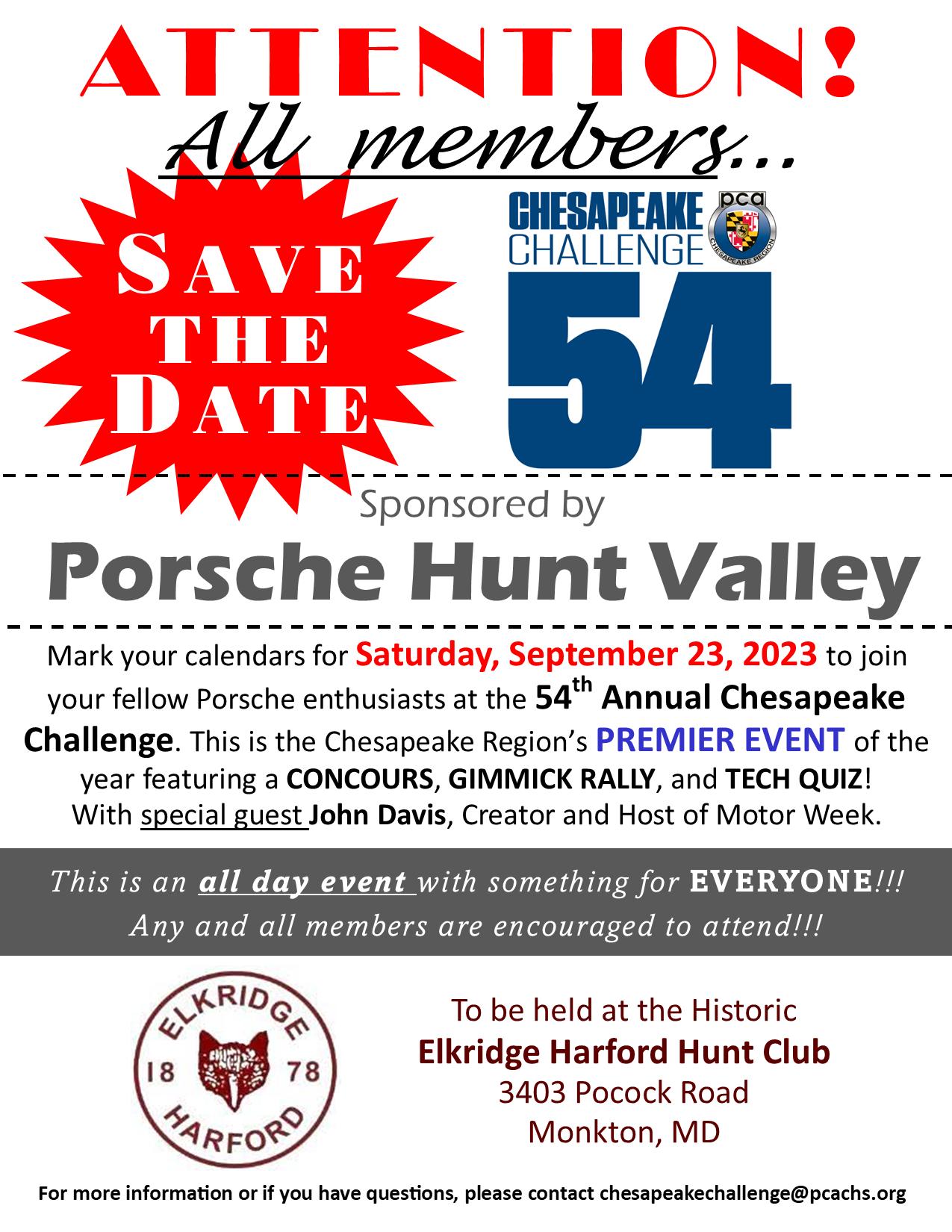 The PorschePatteris the official newsletter of the Chesapeake Region of the Porsche Club of America. Contributions to the PorschePattershould be sent by the 25th of the month preceding the month of publication in Microsoft Word format to editor@pcachs.org. Please send images high resolution. Editor/