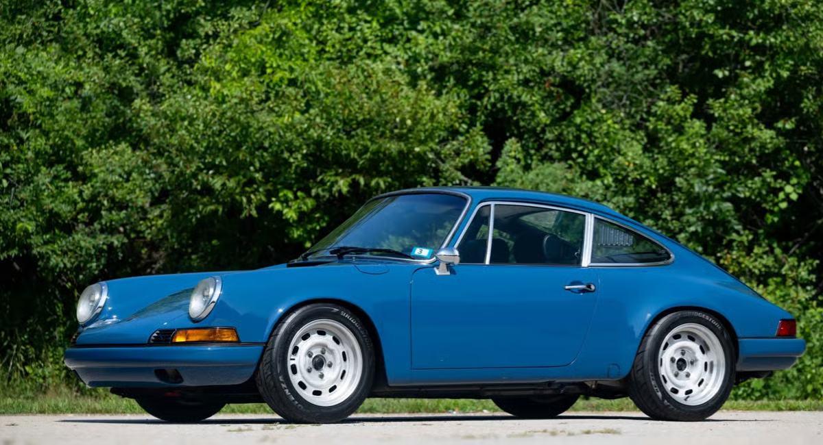 Burgundy but has since been repainted in a beautiful shade of Oslo Blue and fitted with a fiberglass longhood, Carrera-style rear flares, and backdated metal bumpers. What really sets it apart, though, are the 911 R-style polycarbonate rear windows and a set of 16-inch Group 4 wheels.