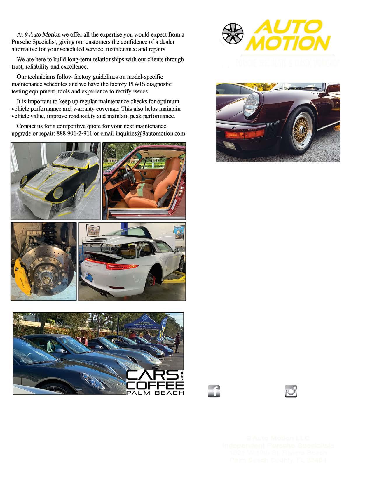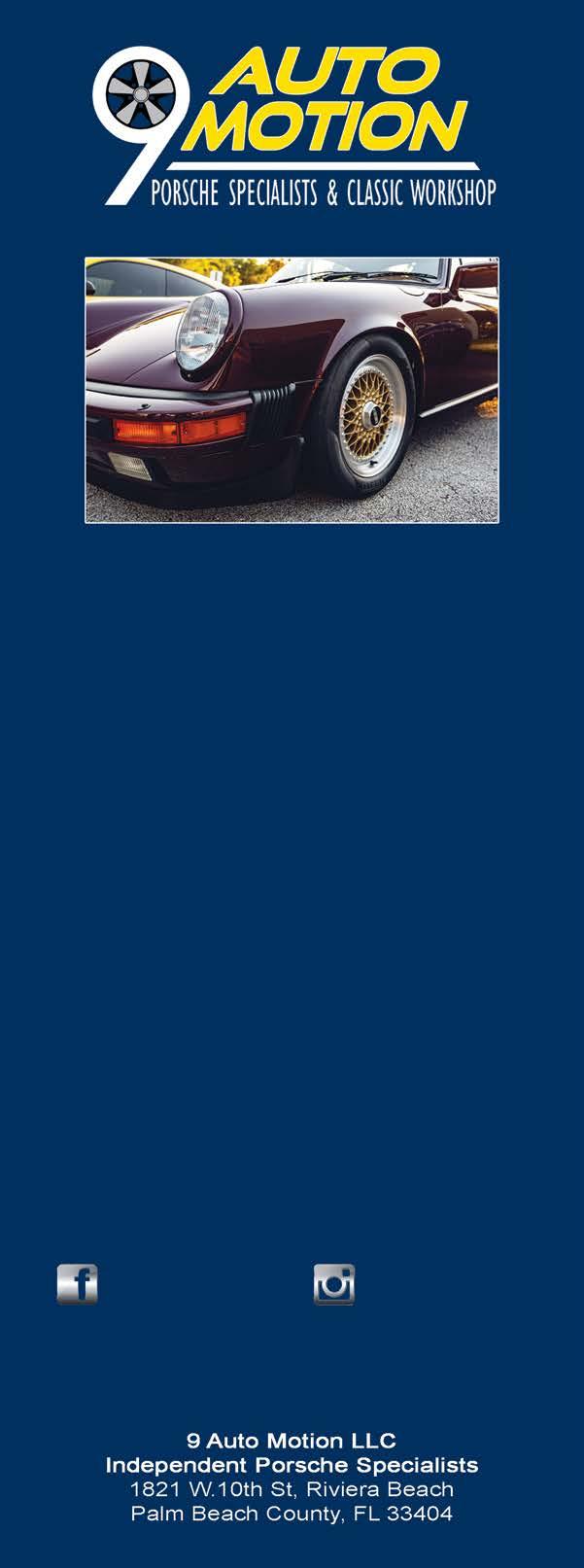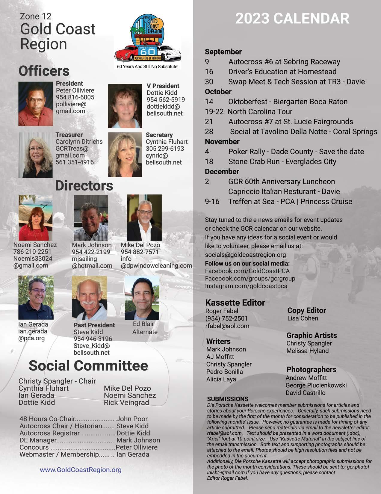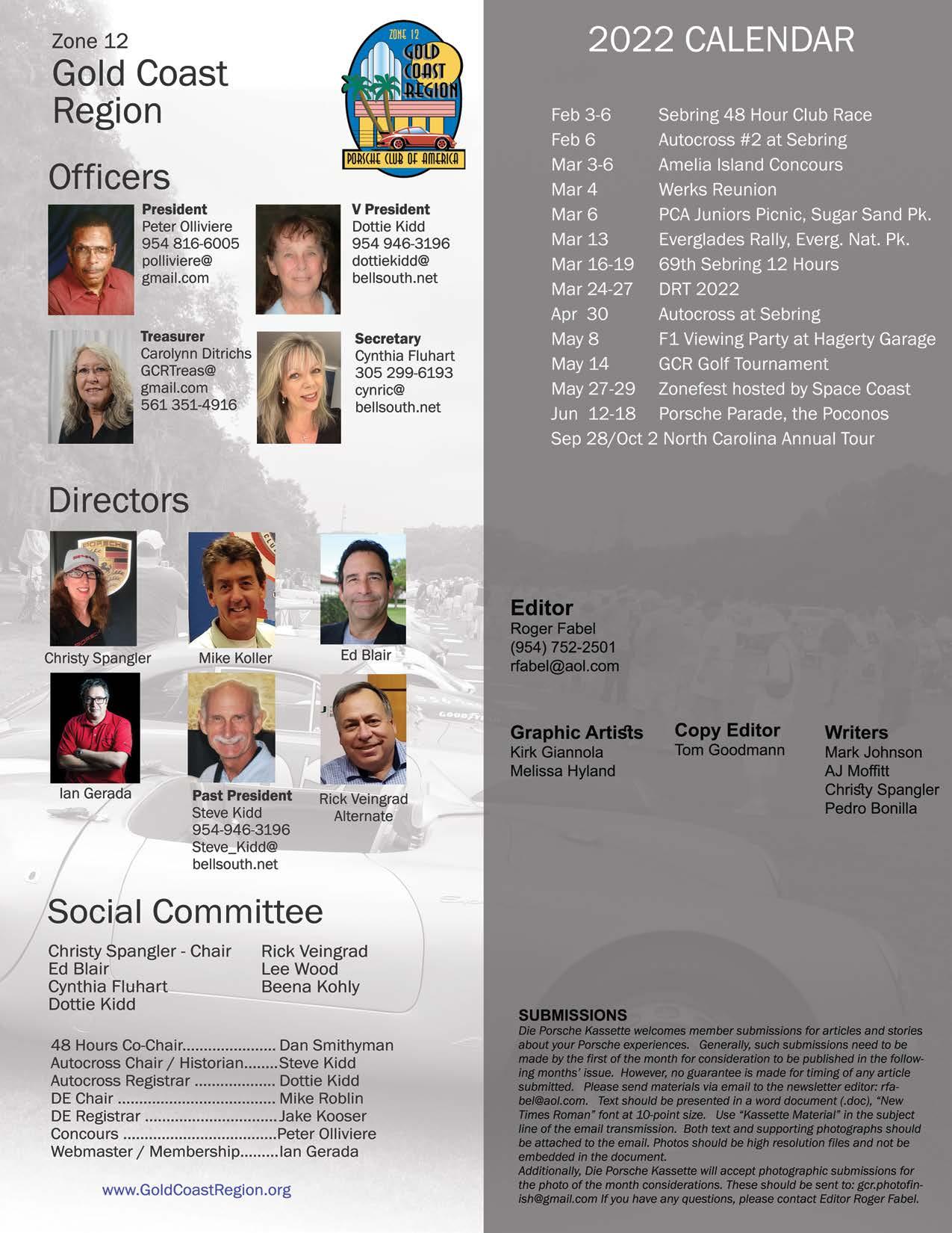 DIE PORSCHE KASSETTE is the official publication of the Porsche Club of America, Gold Coast Region, Inc. and is published monthly. Any statement appearing in the Kassette is that of the author and does not constitute an opinion of the Porsche Club of America, the Gold Coast Region, Inc., its Board of Directors, the KASSETTE editors or its staff. The editorial staff reserves the right to edit all material submitted for publication. Permission is given to chartered regions of PCA to reprint articles in their newsletter if credit is given to the author and the KASSETTE. Publication office: 648 NW 100 Lane, Coral Springs, FL 33071