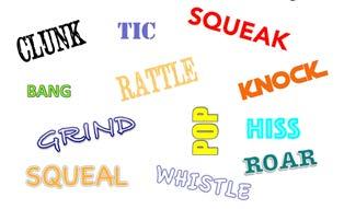 CLUNK is very different from a tick, which has nothing to do with a hiss, a click, a squeal, a knock, a pop, a rattle, a whistle or a bang