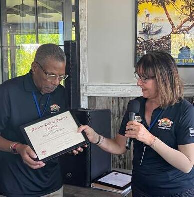 Leslie Sikorski, the Zone 12 Rep on behalf of PCA National, presented Peter Olliviere, the president of PCA Gold Coast Region, with a recognition certificate and letter celebrating the PCA Gold Coast Region’s sixtieth anniversary.