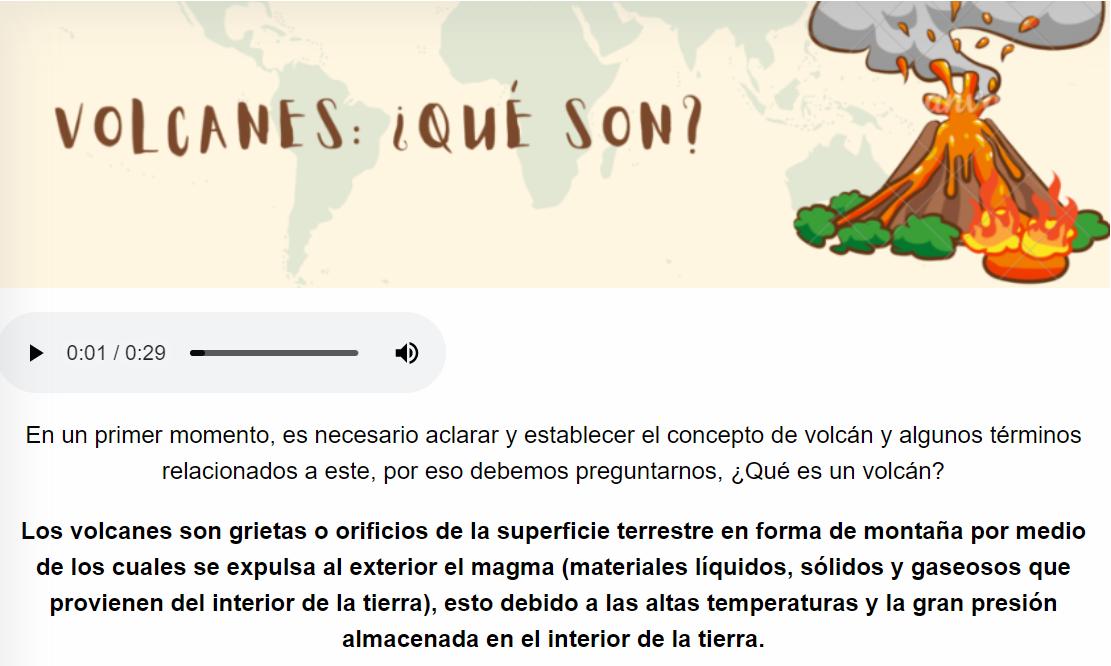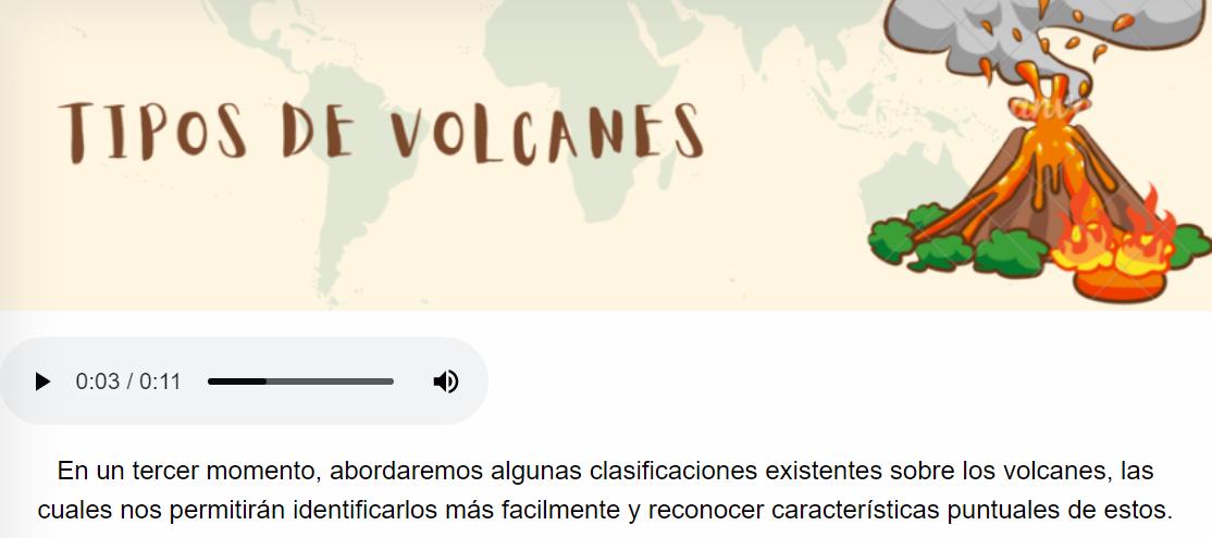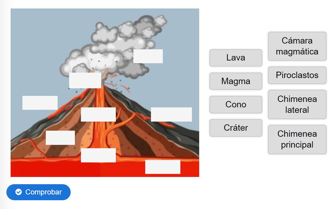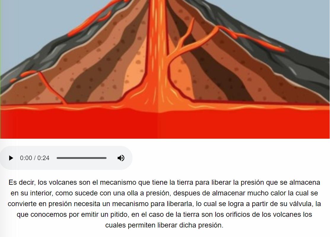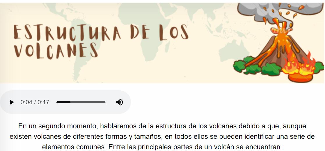 Luego, a partir de una ilustración se explican cada una de las partes que conforma la estructura de los volcanes y se realiza una actividad interactiva para consolidar la información brindada.