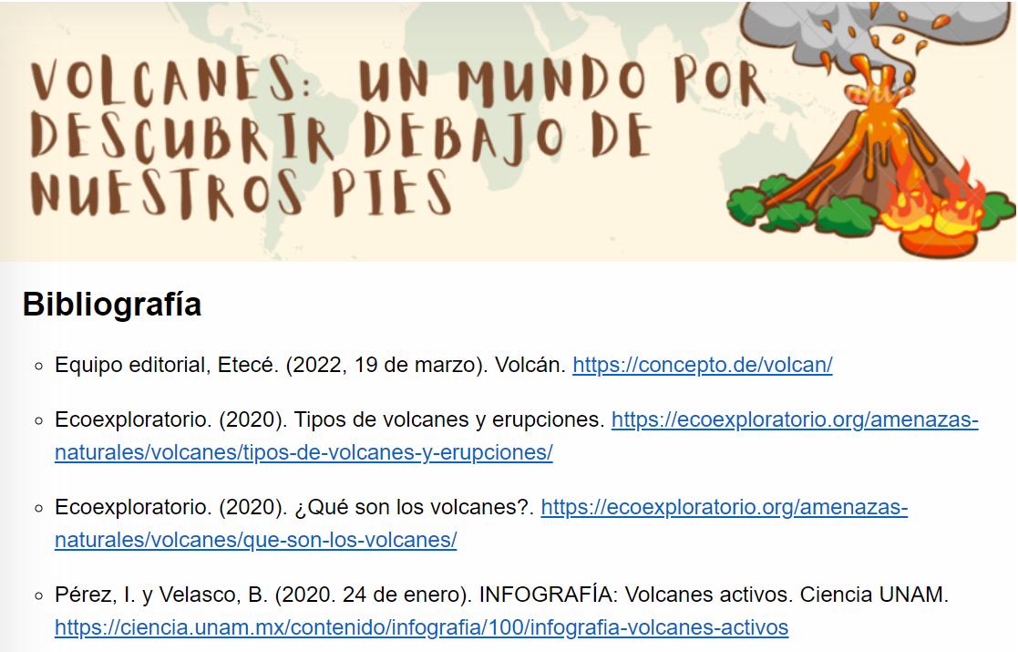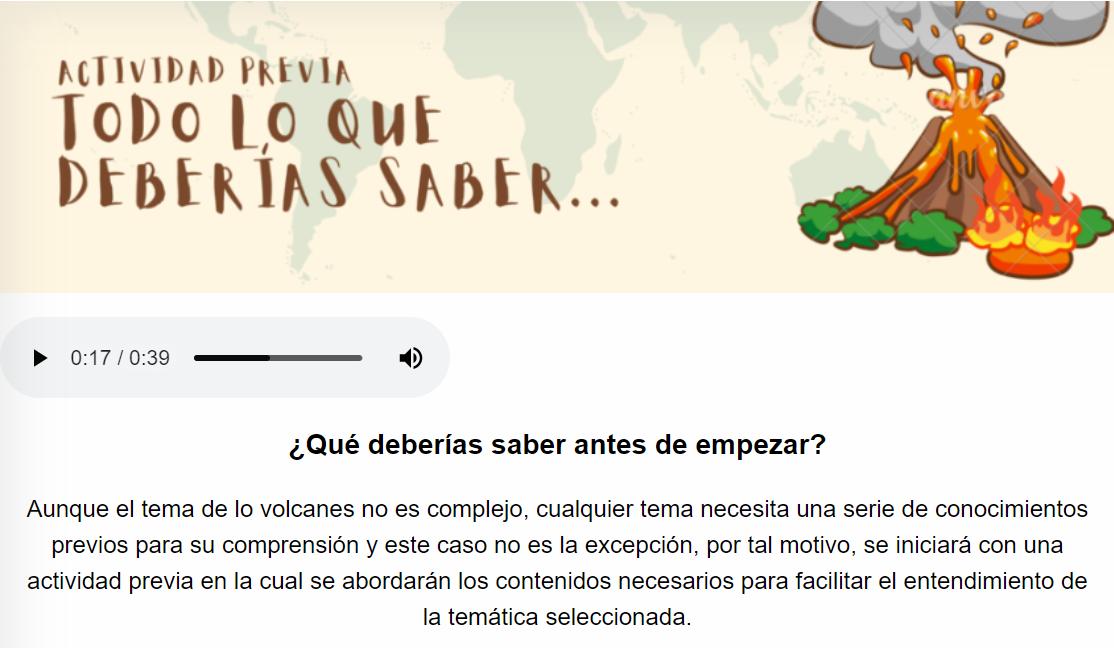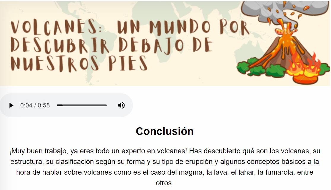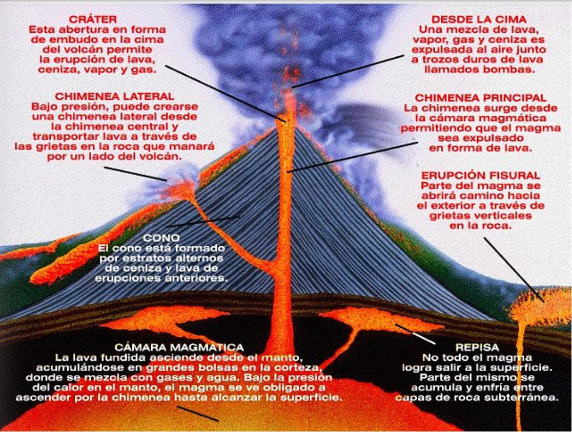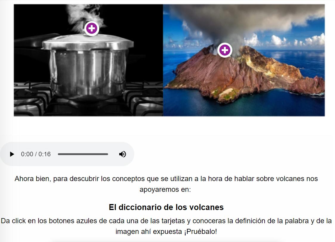 Luego, a partir de una ilustración se explican cada una de las partes que conforma la estructura de los volcanes y se realiza una actividad interactiva para consolidar la información brindada.