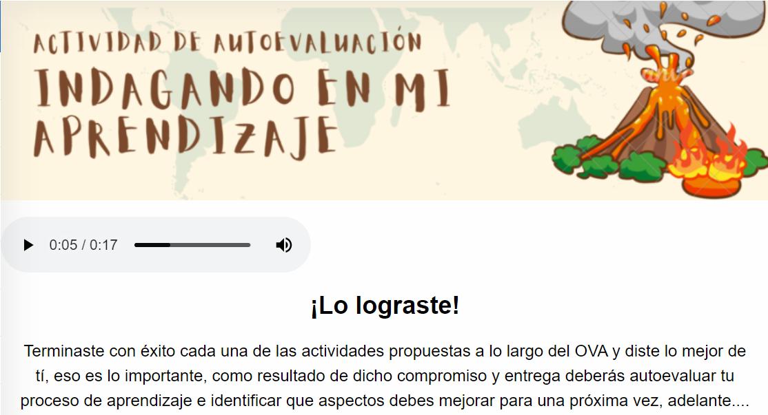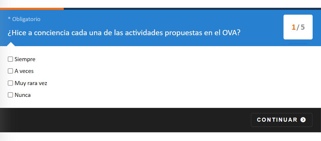 Para finalizar, se le pedirá a los participantes realizar un pequeño cuestionario de autoevaluación, por medio del cual reflexionarán sobre su compromiso, dedicación y entrega durante el desarrollo del OVA.
