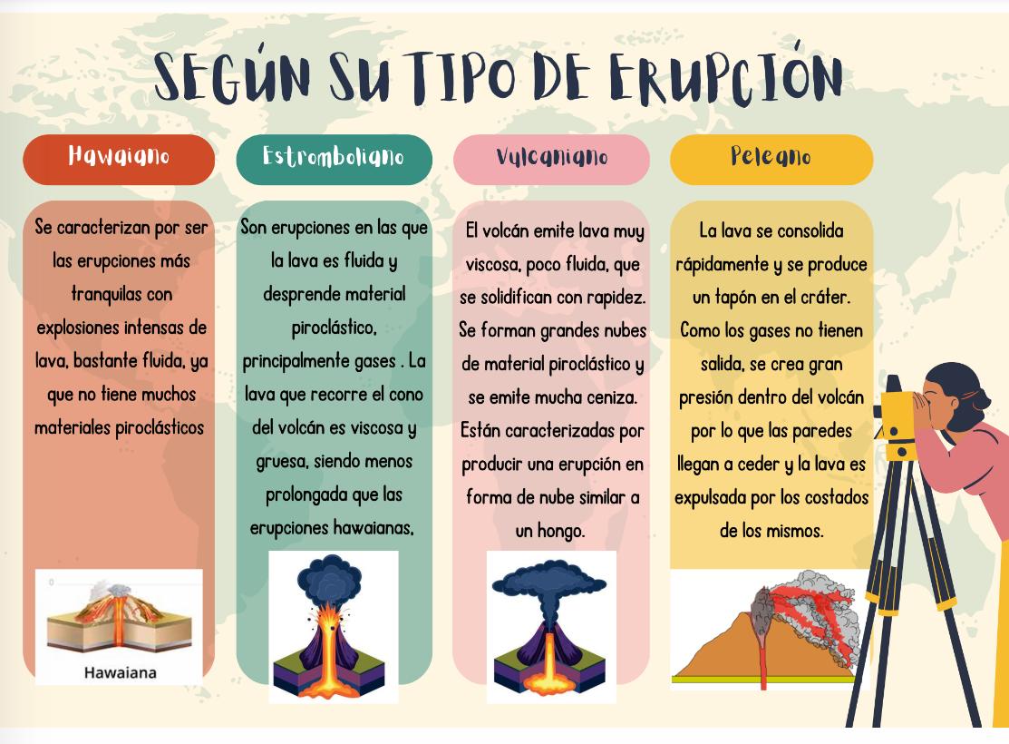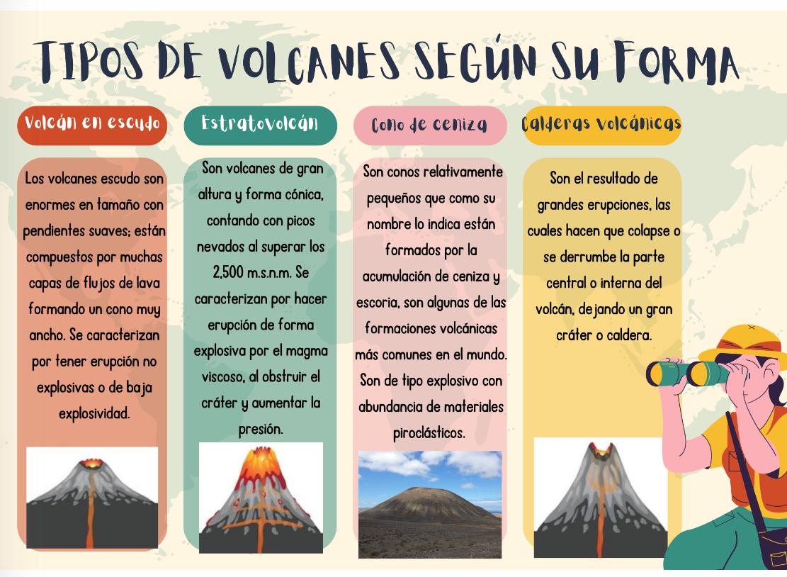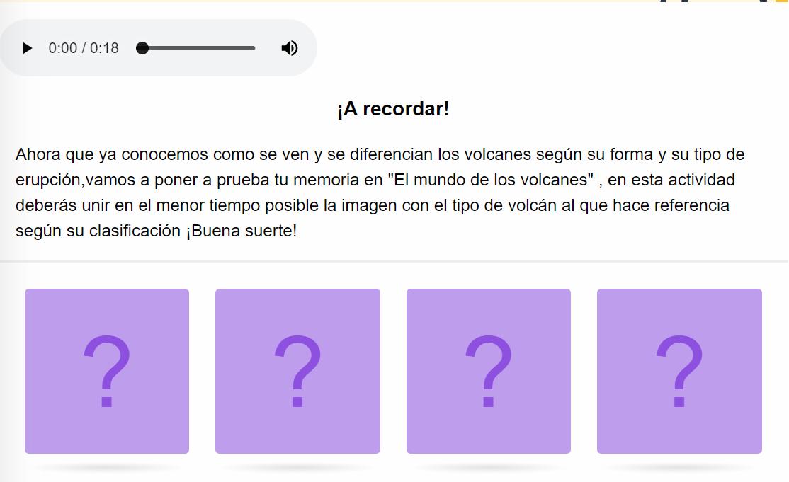Como último contenido temático sobre las características físicas de los volcanes, se decide abordar su clasificación según dos componentes: Su forma y su tipo de erupción. Tras dicha información, se realiza un juego de memoria para afianzar desde el aspecto del volcán o de su erupción sus particularidades y consigo su clasificación.