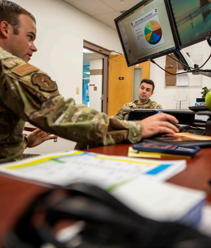 (Above) U.S. Air Force Master Sgt. Cory Bressler, 325th Force Support Squadron airmen development advisor discusses career goals and profession progression with an Airman at Tyndall Air Force Base, Florida, Oct. 20, 2022. ADAs advise on retention and retraining with enlisted and officers by helping find Air Force professional opportunities while keeping in mind their individual career goals.