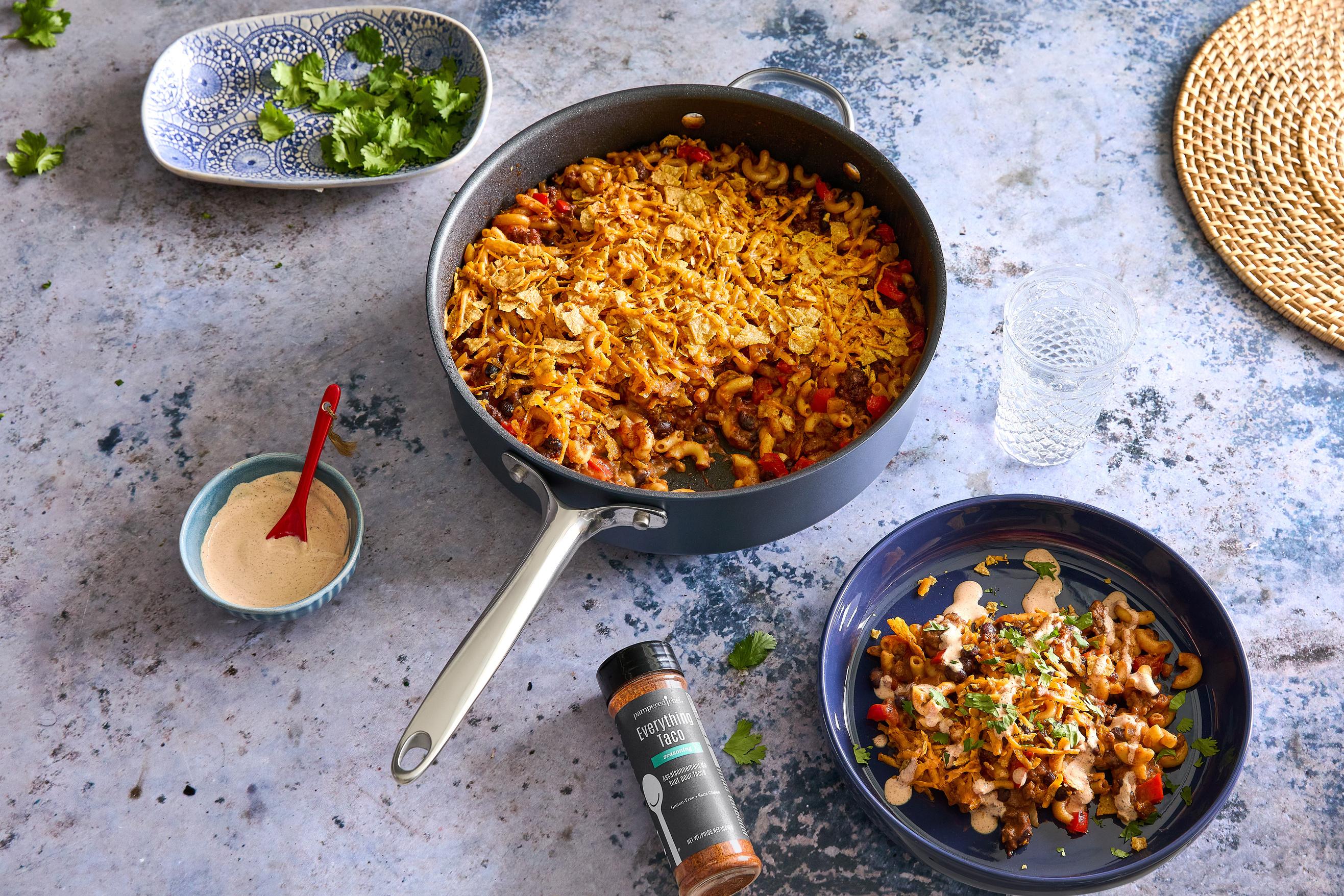 Add the ground beef to the pan, breaking it into chunks. Add the seasoning and cook until browned, about 5–7 minutes. Stir in the black beans, tomato sauce, beef broth, and milk. Bring to a simmer and stir in the pasta. Simmer, uncovered, over medium heat until the pasta is tender, about 10 minutes, stirring occasionally. (If the pasta isn’t tender, add more beef broth or water and continue cooking). Meanwhile, combine the tortilla chips, 1 cup (250 mL) of the cheese, and 2 tsp (10 mL) of the seasoning; set aside.