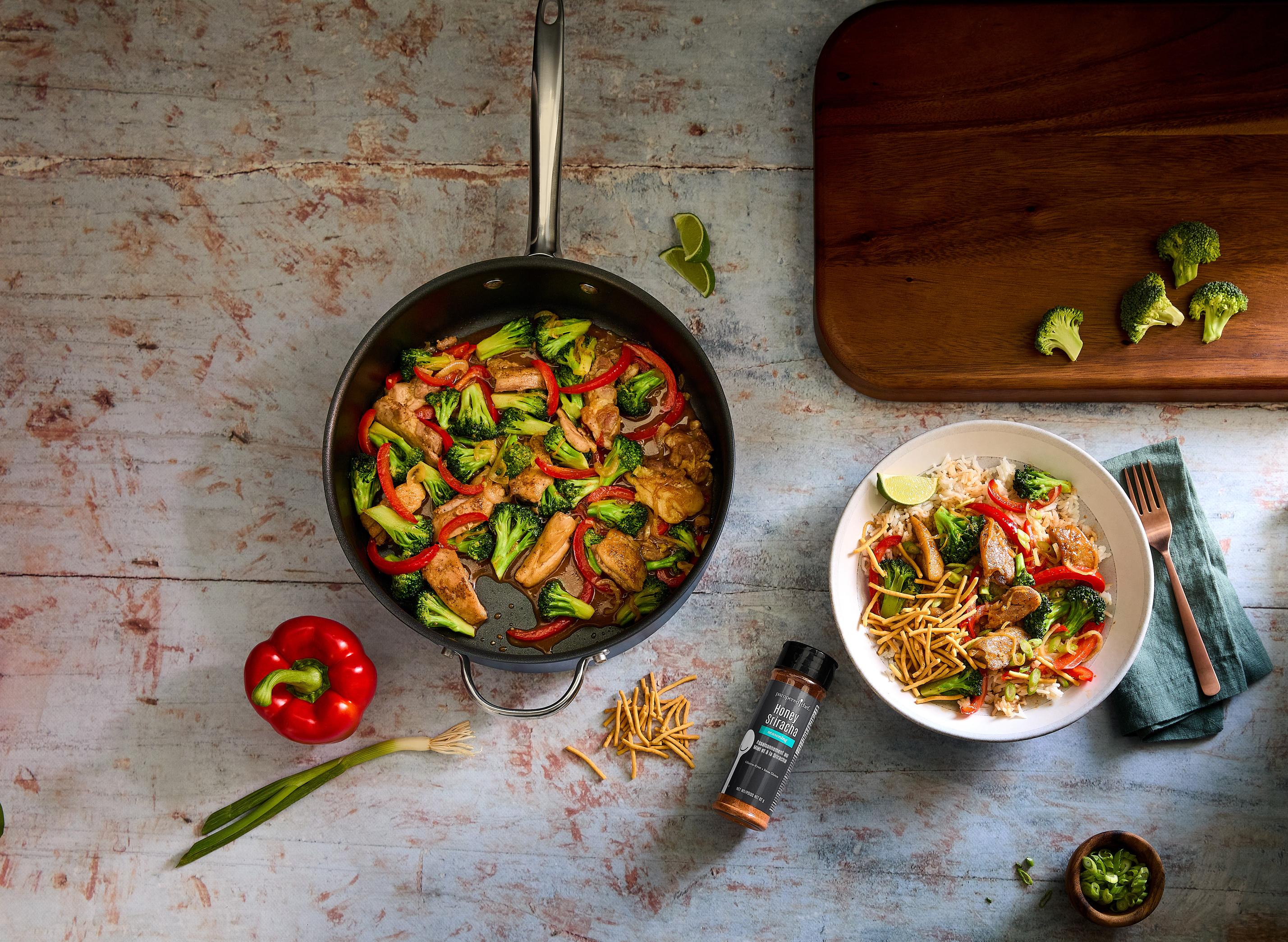 Heat the oil in the 5-qt. (4.7-L) Nonstick Saute Pan over medium-high heat for 3 minutes. Season the chicken on both sides with salt and pepper. Brown the chicken, undisturbed, for 5 minutes. Flip and cook for another 3 minutes. Add the onion, bell pepper, and broccoli and cook for 3 minutes, stirring frequently. Add the garlic and cook for 1 more minute.