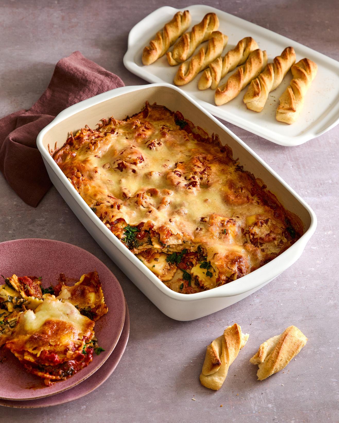 To make the sauce, combine the pasta sauce, diced tomatoes, and Italian seasoning in a large microwave-safe bowl. Microwave, covered, for 5 minutes, stirring halfway through. Spoon a third of the sauce into the bottom of the Stone Rectangular Baker. Place a third of the ravioli over the sauce in a single layer. Crumble half of the spinach over the raviolis. Top the spinach with a third of the cheese. Repeat. Place the final layer of raviolis over the top of the cheese. Spread the remaining sauce over the ravioli and top with the remaining cheese Bake, uncovered, for 45 minutes Meanwhile, unroll the pizza dough and cut into 8 equal strips Fold the strips in half and twist into 6" (15-cm) sticks. Place on the Stone Serving Tray.