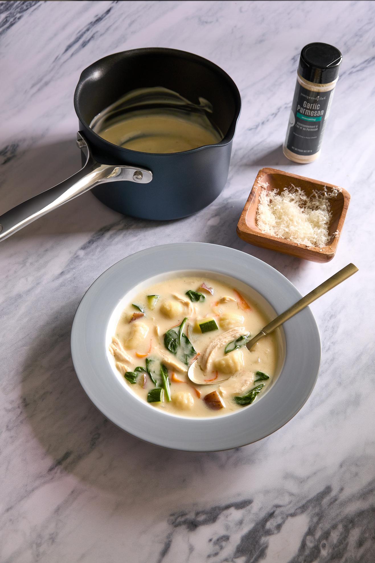 About 5 minutes before serving, add the chicken, gnocchi, and zucchini to the pot. Stir and cook until the zucchini is tender and gnocchi are cooked, about 3–5 minutes.
