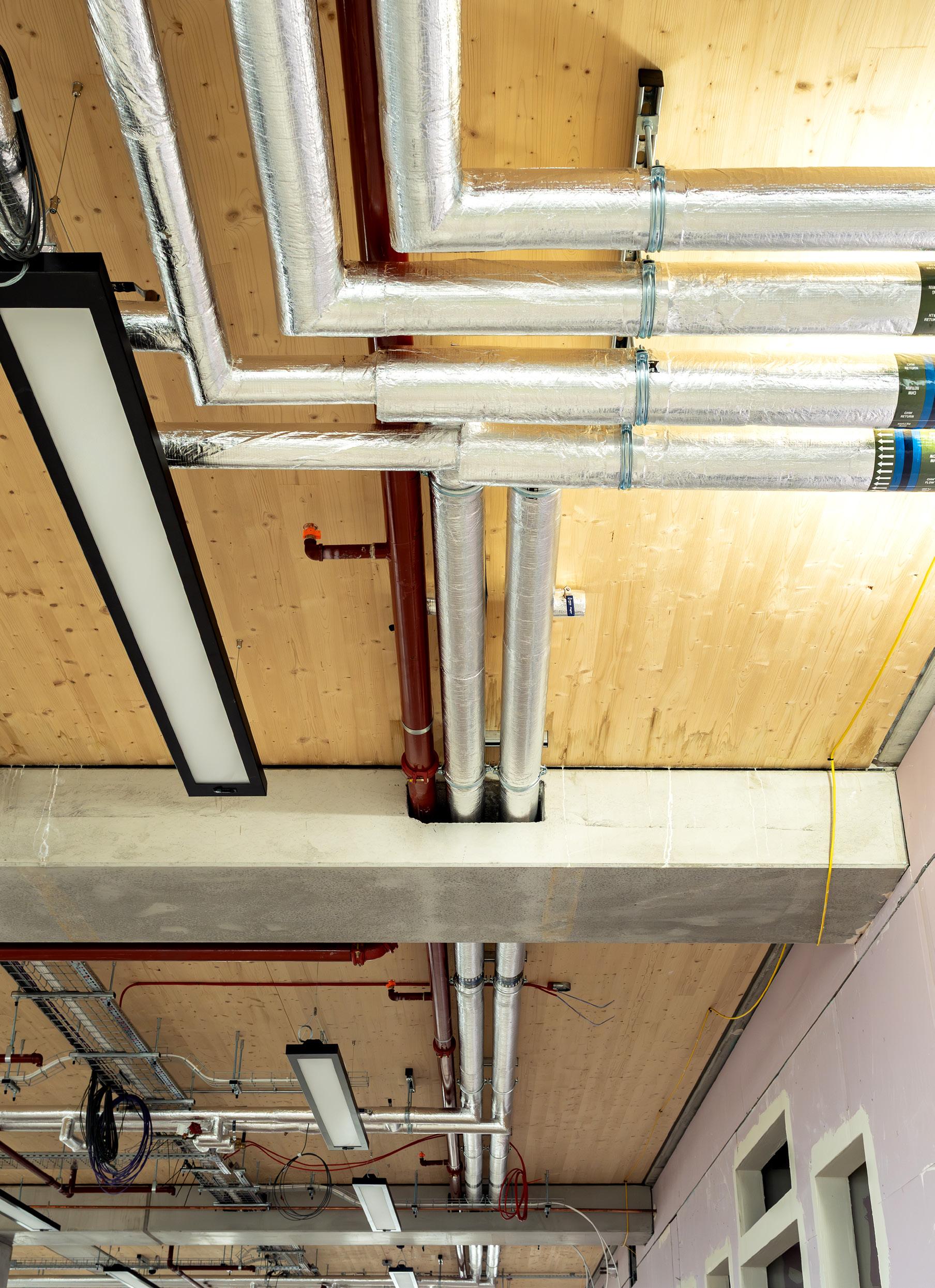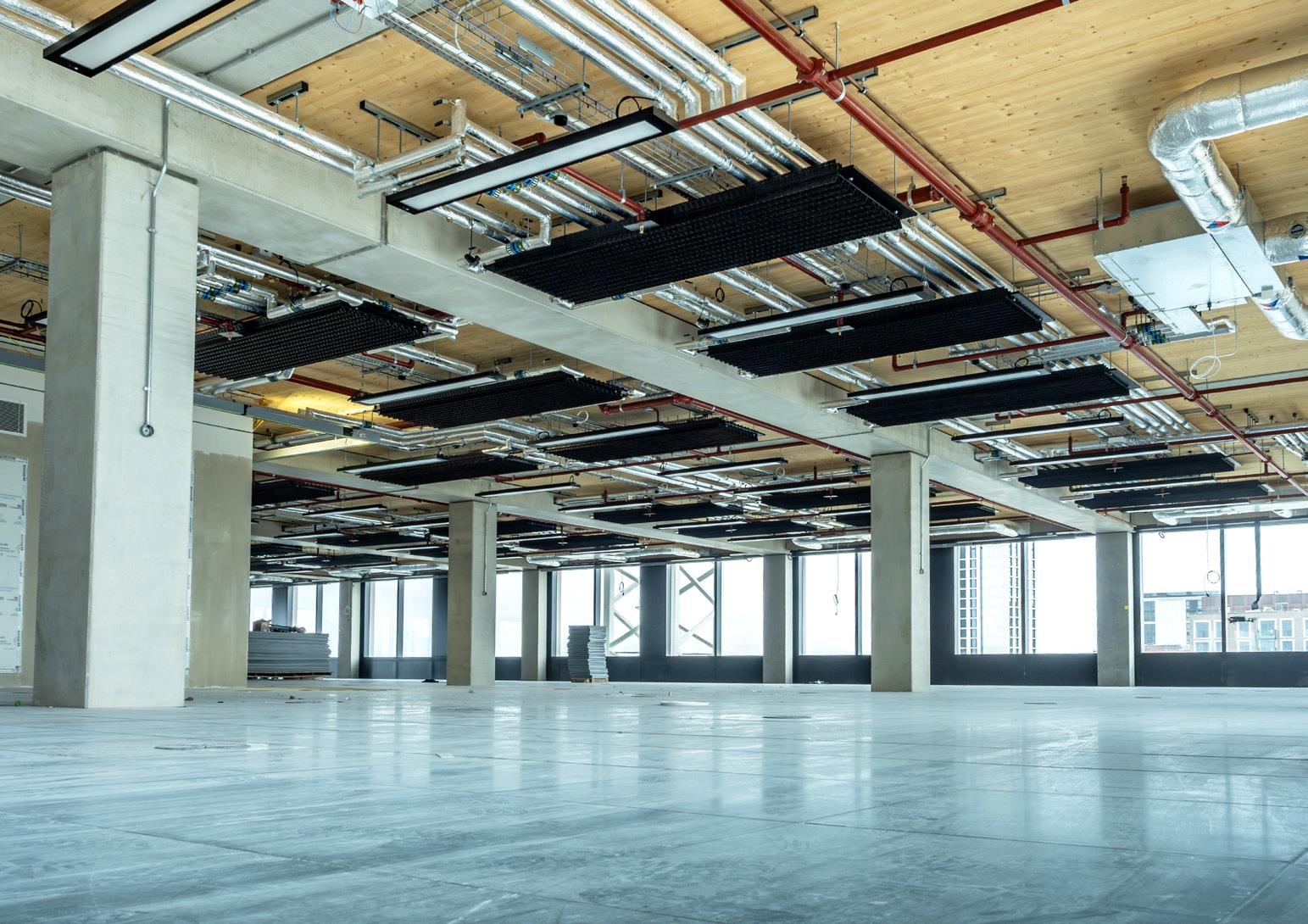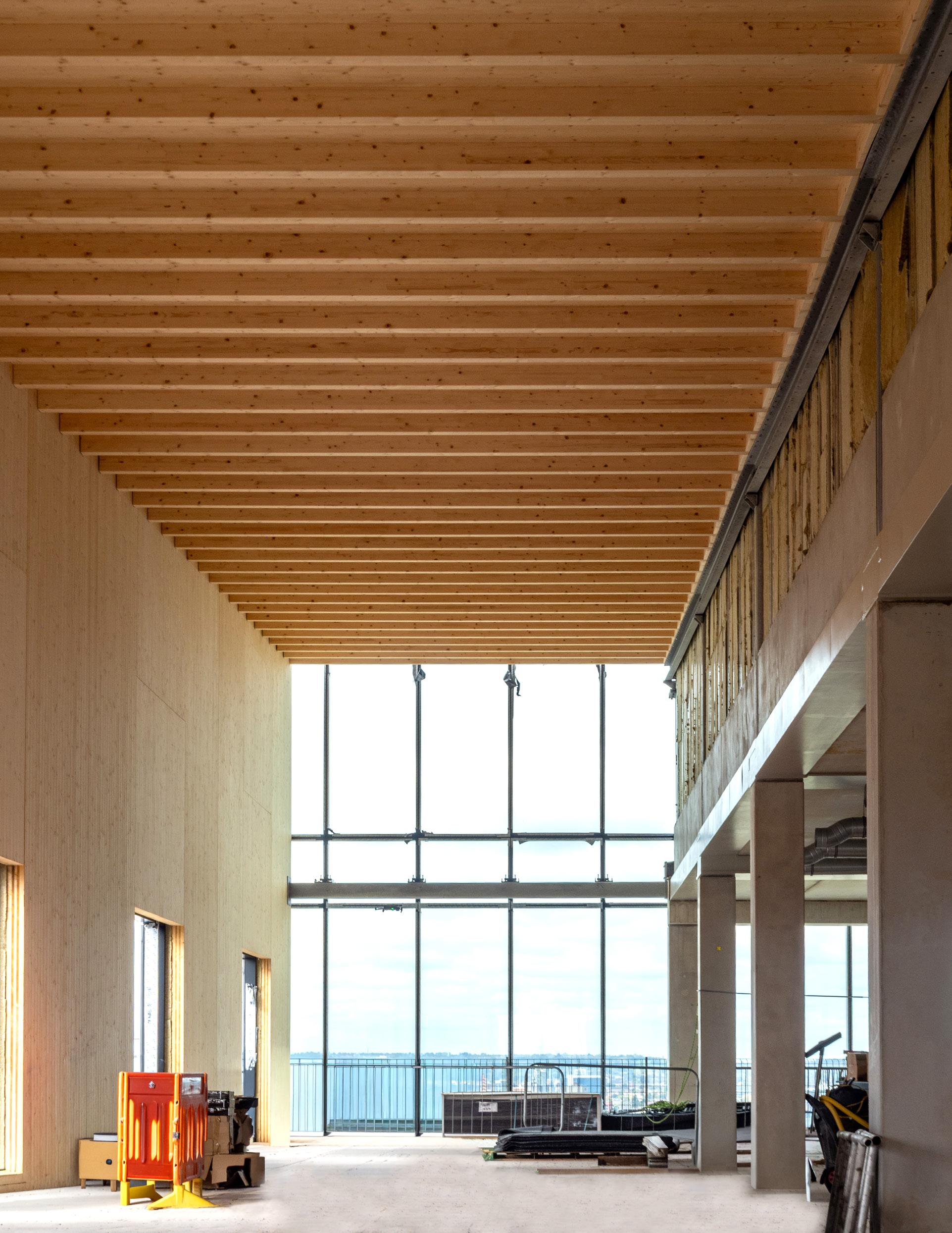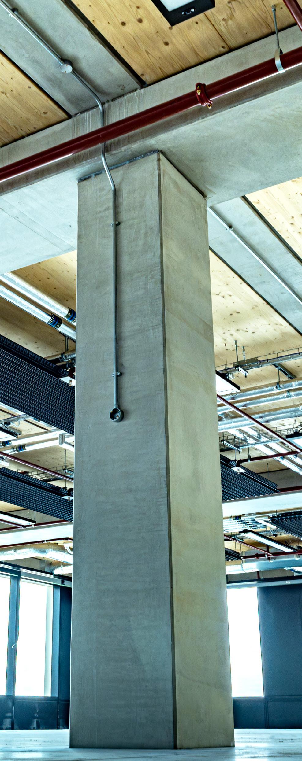 Engineered cross-laminated timber (CLT) floors were combined with the precast concrete structural frame and core. This use of innovative materials was driven by sustainability and aesthetics.