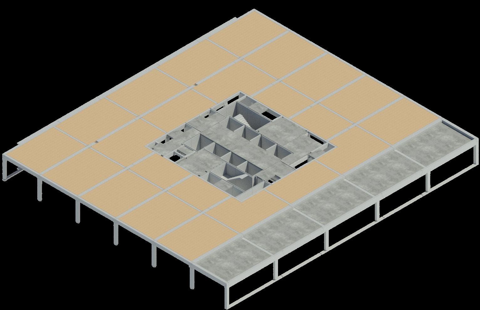 Pre-stressed floor units spanning between spine and edge beams were cast flat on steel tables in their final orientation, ensuring a highquality finish to the face.