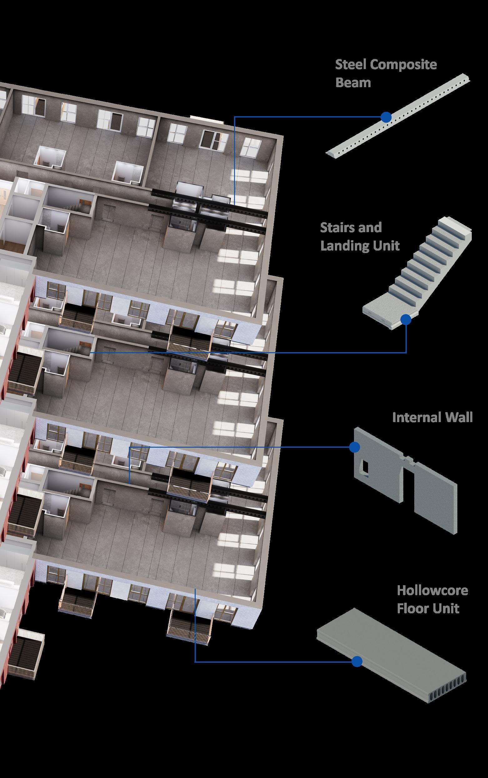 Façades, windows, and balconies offsite, eliminating the need for scaffolding. improved safety by reducing work the sales experience, showcasing architectural façade throughout the included balcony connectors that accommodated movement, along and sockets to minimise on-site labour.