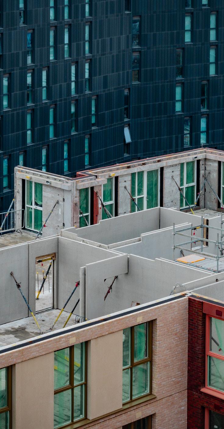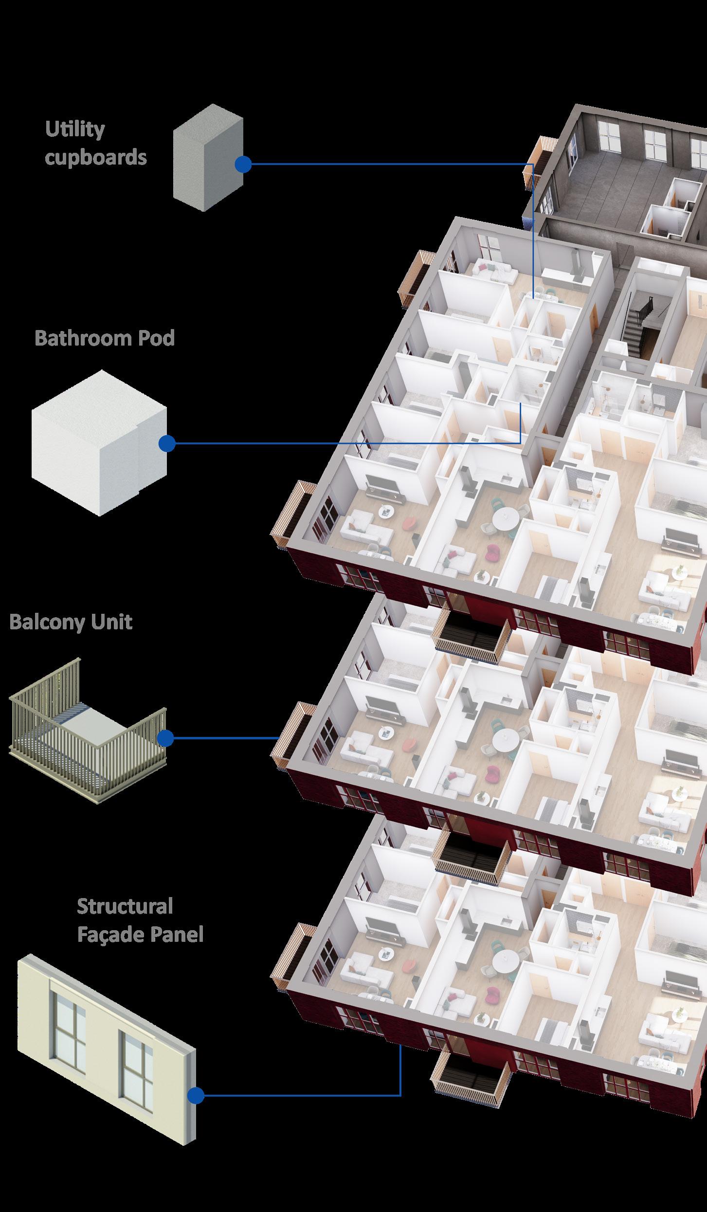 • Flexible supply chain: UK & Europe specialists; components can be preintegrated with façades, windows, balconies, M&E, bathroom pods, and utility cupboards