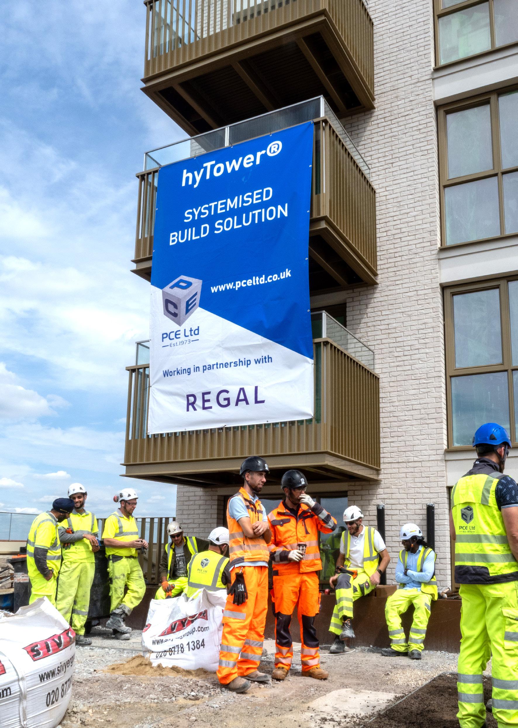 Beyond earlier access for follow-on trades and the enhanced sales experience of a scaffoldfree build, PCE’s scope extended to lifting and placing prefabricated bathroom pods, utility cupboards, and integrating full M&E coordination. The hyTower system provides a truly comprehensive structural solution, supporting wider delivery activities such as setting internal partition walls, installing SVPs, window dressing, vapour barriers, ductwork, and screeding.
