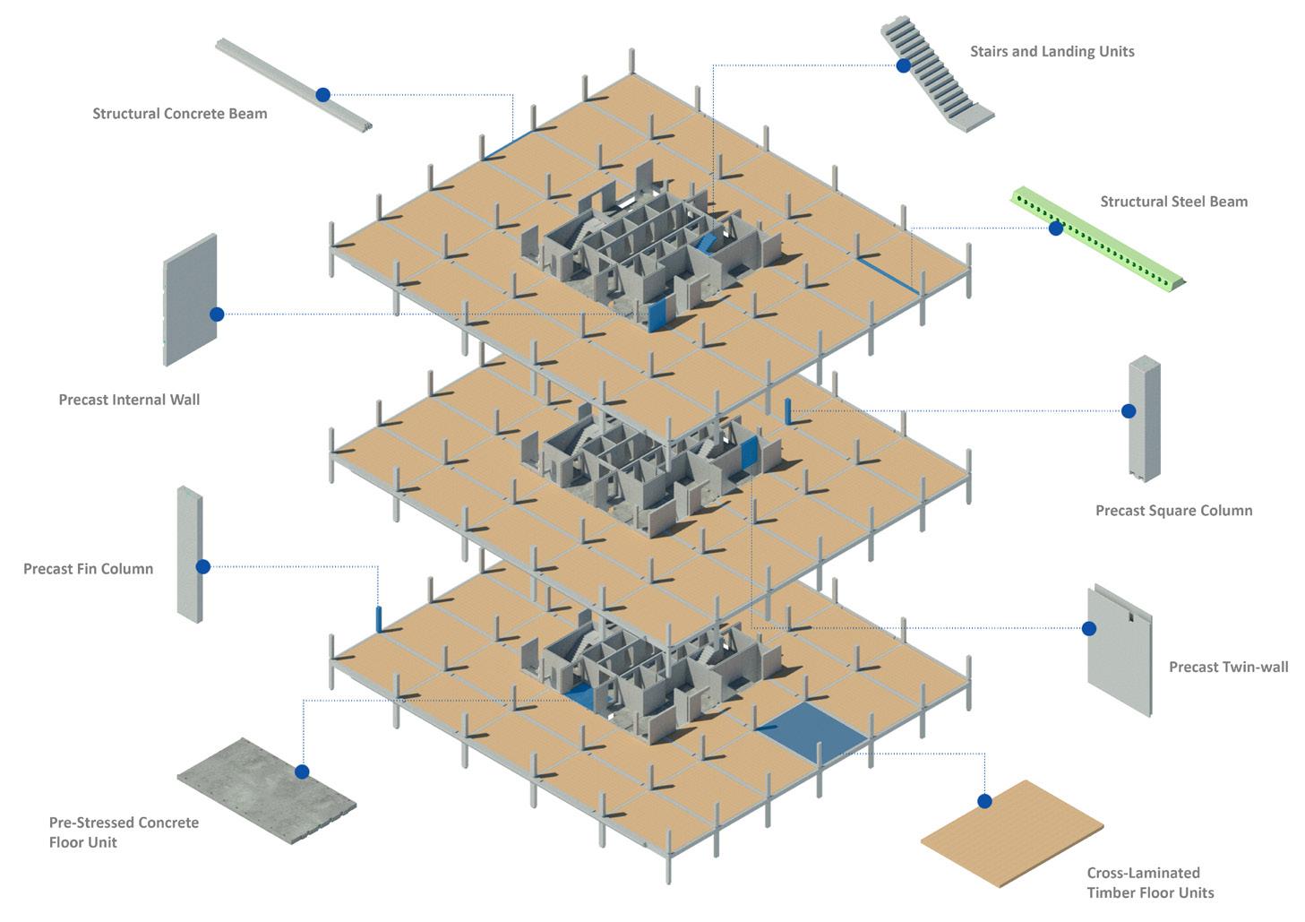 Through common connection principles and with access to toptier offsite specialists, our structural solutions can easily accommodate a hybrid of structural materials, combining precast concrete, reinforced steel, and engineered timber. This means the right product is used for the right solution, tailored to specific structural, aesthetic, and sustainability targets.