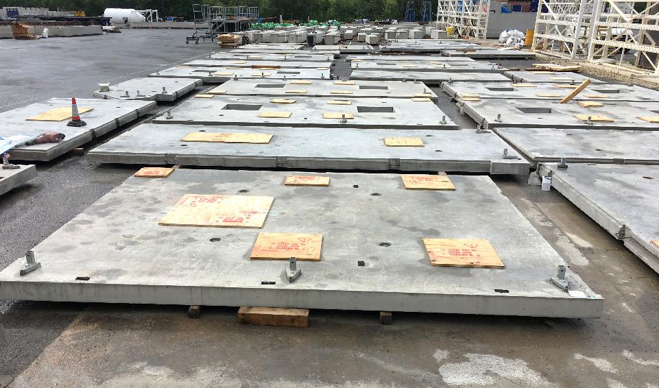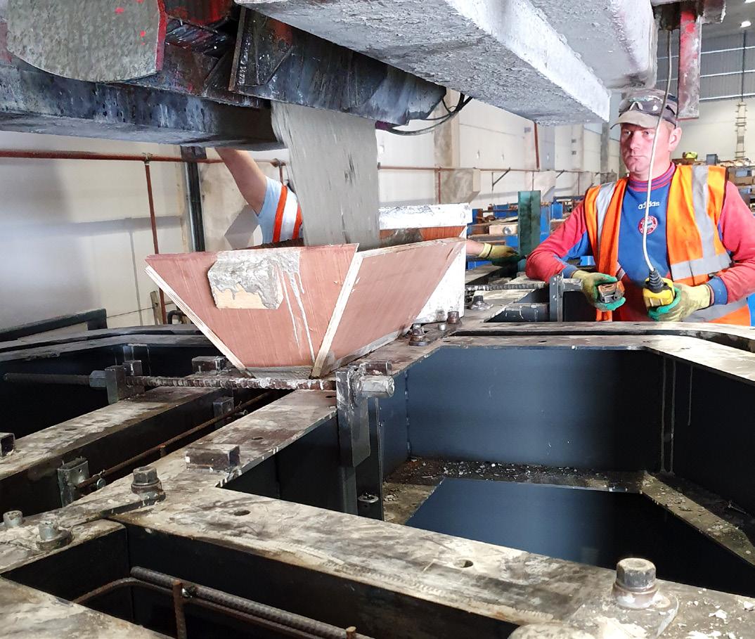 Cell roof components are cast flat on steel tables in their final orientation, ensuring a highquality finish to the cell ceiling and providing a floated finish to the upper face which forms the plant room floor. Magnetized steel formers are fixed onto the moulds to create the main roof light opening.