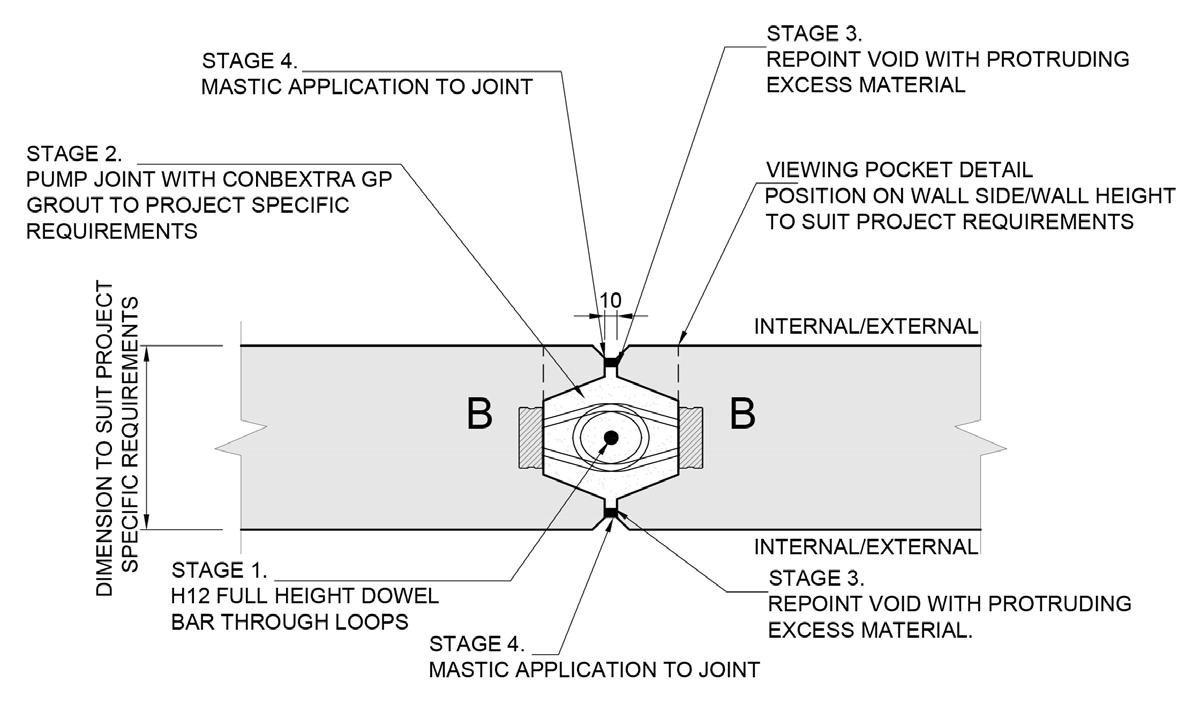 Corridor walls connect together with reinforcement ties through projecting wire loops in a grouted keyed joint which is expressed with chamfers and fixed with mastic, creating a visually pleasing joint line.