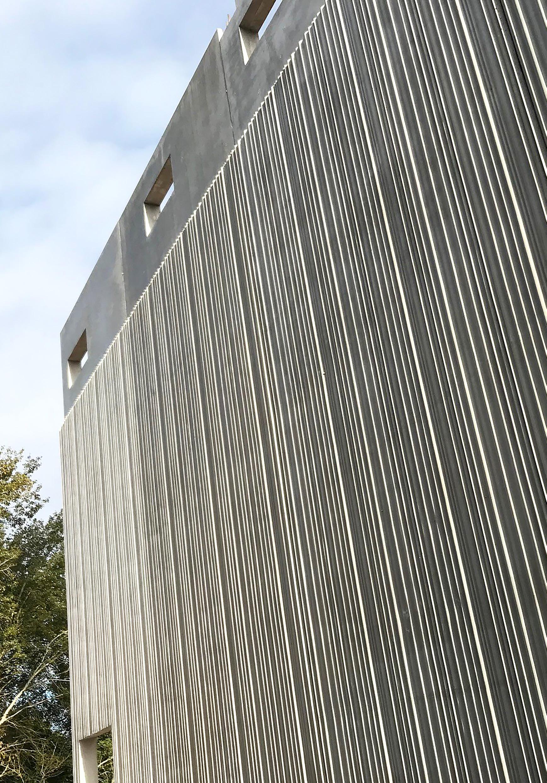 The digitally engineered and Offsite manufactured structural frame features areas of high quality exposed precast concrete which are visible from inside the building. The team commenced installing some of the nine-metre-high architecturally finished pre-cast concrete Auditorium and Core wall panels near the very start of the build. These walls were cast using a Reckli form liner system to produce wave and board marked effects to the surface of the panels, giving a high quality exposed concrete finish. This was applied to both sides of the units in some areas. These exposed finishes formed an important architectural feature in various areas within the building including the café area, the auditorium and around the cores.
