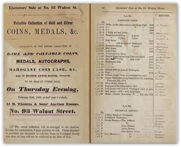 Finding the first two-figure coin wasn’t easy, as the very earliest U.S. coins offered at public sale were not well-documented. It is widely accepted that the first U.S. auction primarily dedicated to rare coins and medals that attracted nationwide attention was the collection of Dr. Lewis Roper, sold by Thomas and Sons on February 20, 1851 in Philadelphia.