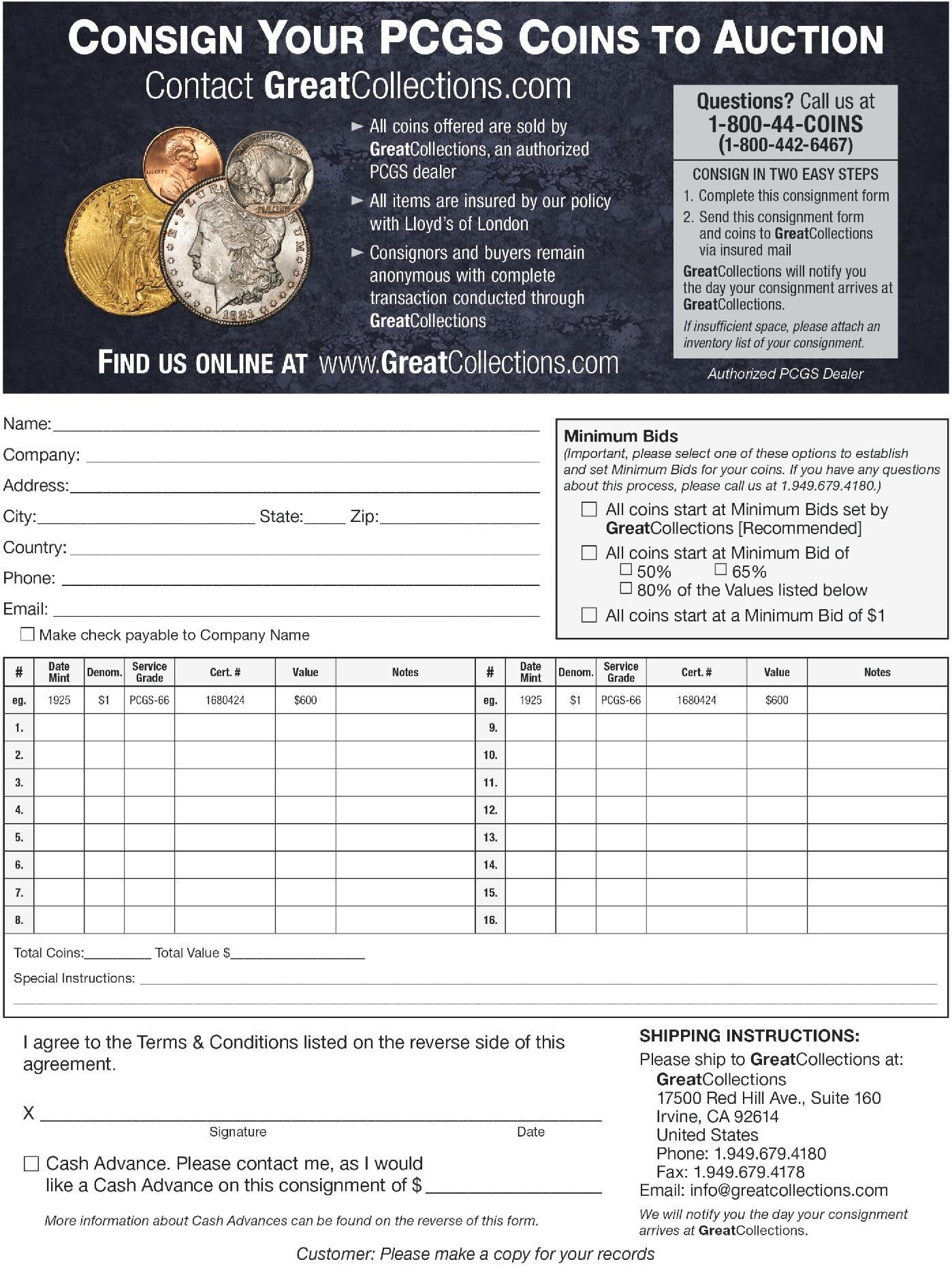 Cash Advances: We offer generous cash advances for all consignments at a competitive interest rate. Checks can be sent via overnight Fedex or Express Mail within 24 hours of your coins arriving at GreatCollections. Please check the box on the reverse of this form (below the signature line) and we will contact you as soon as we have reviewed your coins.