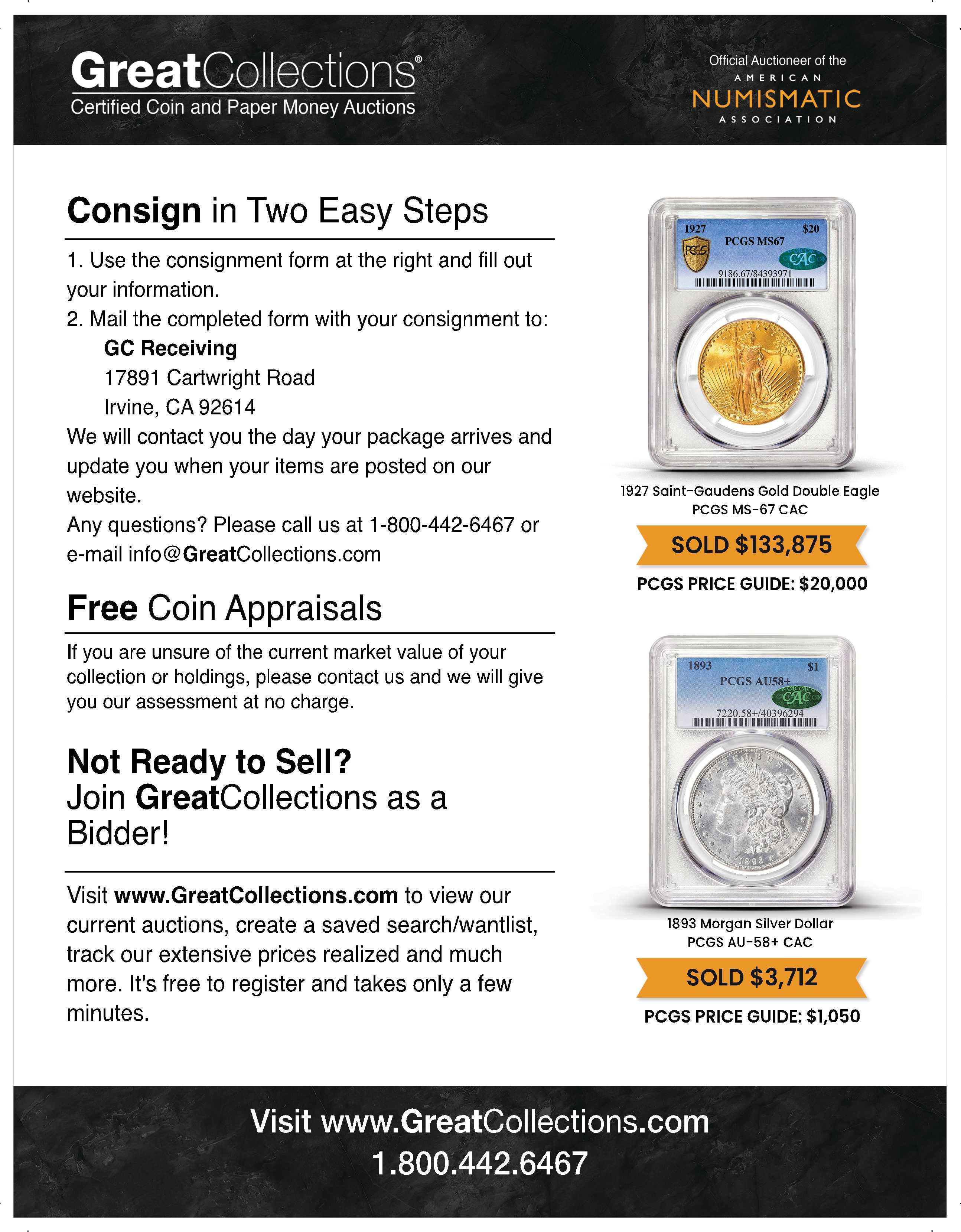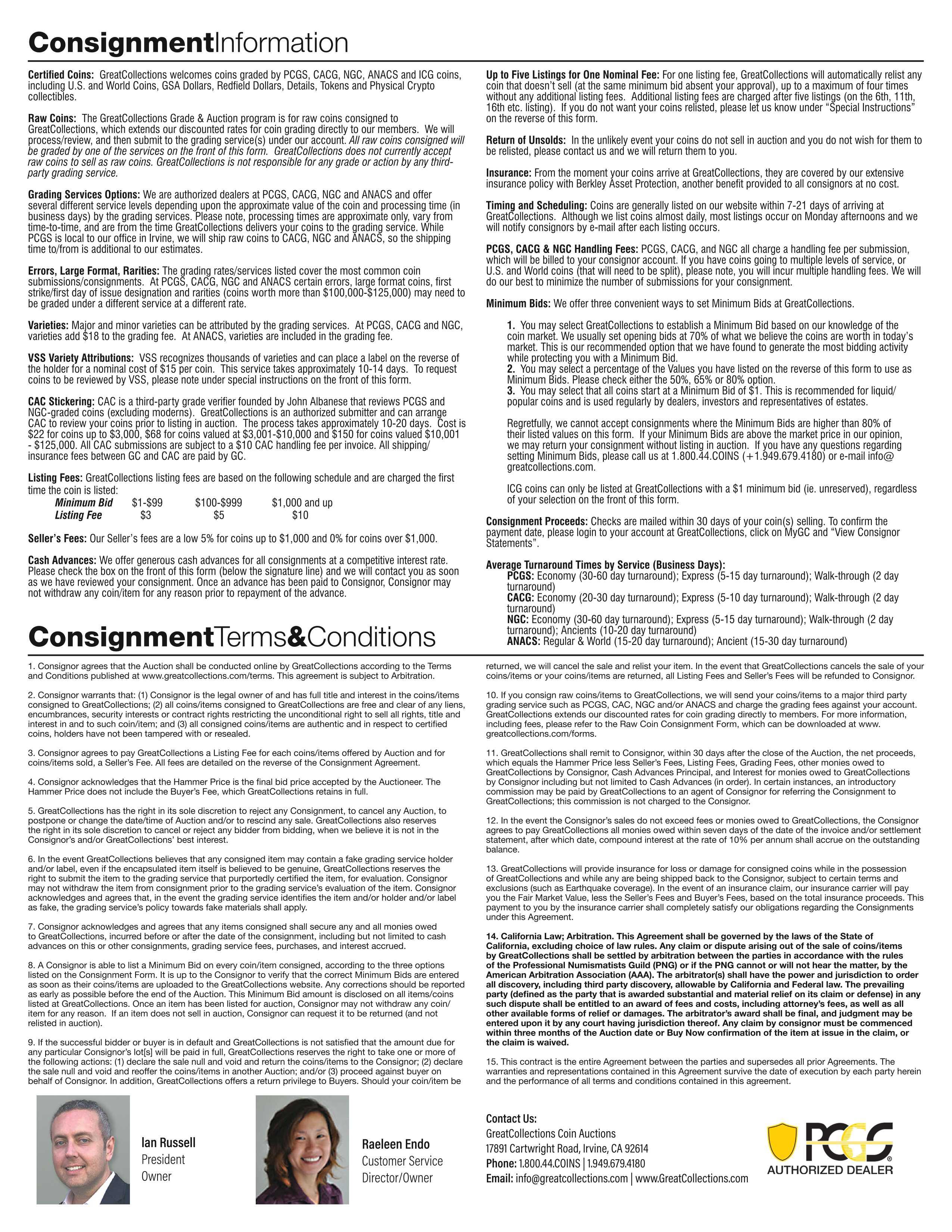 (Select one of these options to establish and set Minimum Bids for your coins. If you have any questions about this process, please use the phone number at on the bottom of this form) A. All coins start at Minimum Bids to be set by GreatCollections [Recommended] B. All coins start at Minimum Bid of