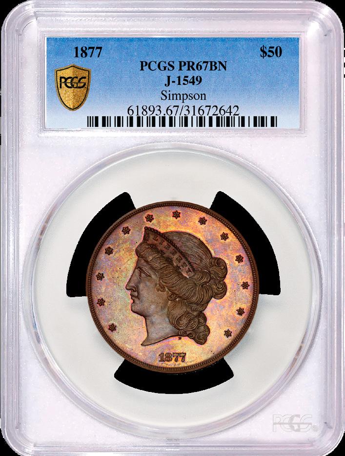 Despite their large size and beautiful Coronet design, only seven examples of the 1877 $50 Half Union are known that were struck in copper, and just one coin is believed to be in private hands. Most other surviving examples are held in museums or institutions. The concept behind the 1877 $50 Half Union was first presented in the 1850s. Fast forward more than 20 years, and Director of the United States Mint Henry Richard Linderman ordered examples of the 1877 $50 Half Union patterns struck for himself. Today, these pieces serve as time capsules of a tumultuous time in American history and provide a glimpse of what the coin would have looked like if it was struck for circulation. A spectacular example of this coin, graded PCGS MS67BN, was sold by Heritage Auctions for $408,000 in 2024.