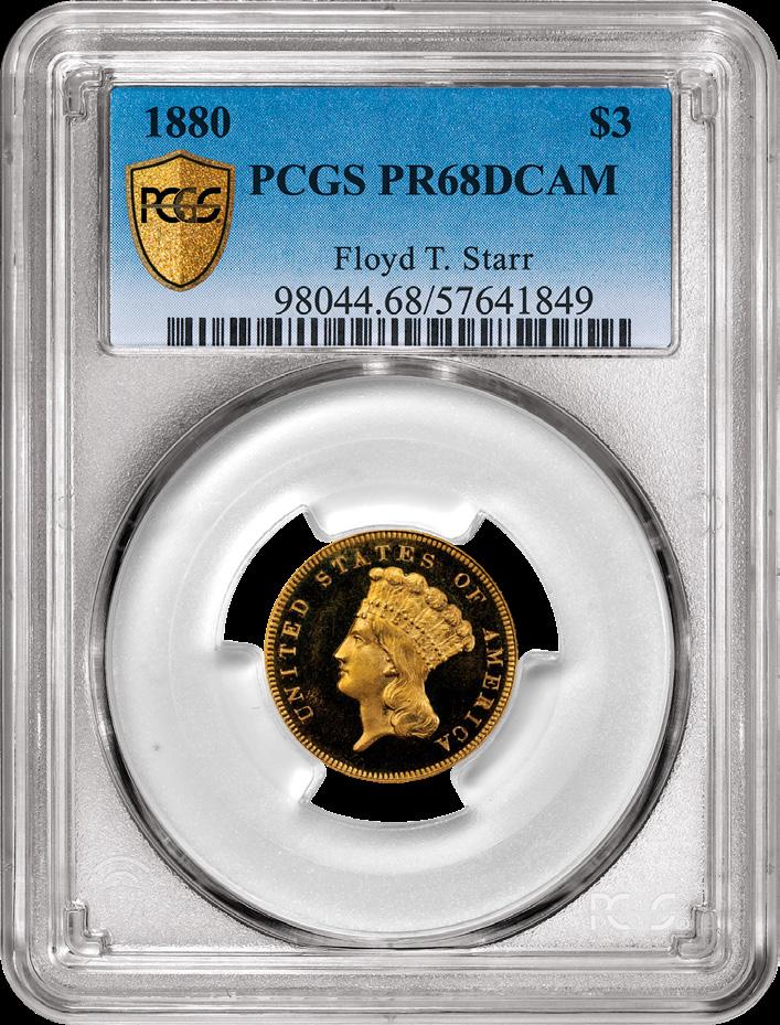 Few coins are as breathtaking as this 1880 $3 Indian Princess graded PCGS PR68DCAM, making it the finest-known example for the entire series. This stunning example is part of the exceptional Floyd T. Starr collection, which included a nearly complete set of proof $3 Indian Princesses assembled between 1937 and 1962. These coins were originally purchased from Wayte Raymond, though the purchase price and date of that momentous transaction are unknown. The Raymond/Starr pedigree as ascribed to the subject coin here is numismatically significant, and furthermore, this example is a rarity of a grand scale, as only 229 PCGS-graded proof examples of the $3 Indian Princess across the entire 36-year series have earned the coveted DCAM designation. The unique opportunity to own the finest known $3 Indian Princess proof with its fabulous pedigree spurred tremendous bidder action, with the coin realizing an astounding $312,000 in an August 2025 Stack’s Bowers Galleries offering.