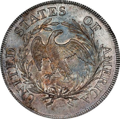 Only a year after the Flowing Hair Dollar debuted, the type was replaced by the Draped Bust Dollar. Like its predecessor, the Draped Bust Dollar was designed by sculptor-engraver Robert Scot and features a portrait of Miss Liberty that is hypothesized to have been modeled after Philadelphia socialite Anne Willing Bingham. The Draped Bust portrait on the obverse of the dollar marked the first time this widely familiar motif was used on any United States coin. When the Draped Bust Dollar debuted in 1795, the reverse carried a Small Eagle design similar to that seen on the Flowing Hair Dollar. However, the Small Eagle reverse was replaced with a Heraldic Eagle design in 1798 and stuck with the Draped Bust Dollar for the remainder of the coin’s run.
