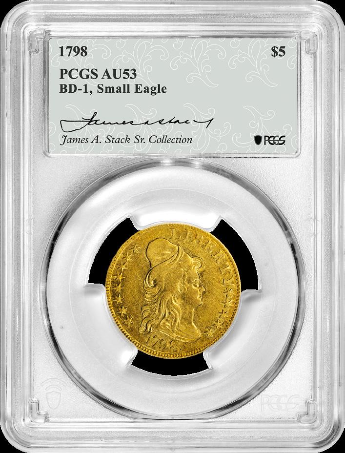 As we begin ramping up our 40th anniversary celebration, we also share here in this last issue of PCGS Insider for 2025 a multitude of articles that speak to the strength and diversity of our hobby. Perhaps one of the biggest stories to unfold as we turn the final pages of this year is the sale of the James A. Stack, Sr. Collection, being offered by Stack’s Bowers Galleries in December 2025 and February 2026. There are many highlights to share about this incredible collection and the 200 prestigious coins that will cross the block. However, one of the most incredible trophies from this majestic collection is a 1798 Draped Bust Half Eagle, Small Eagle graded PCGS AU53, being offered by Stack’s Bowers Galleries. Such coins rarely come to market, and when they do, they attract the most well-heeled and esteemed numismatic connoisseurs.
