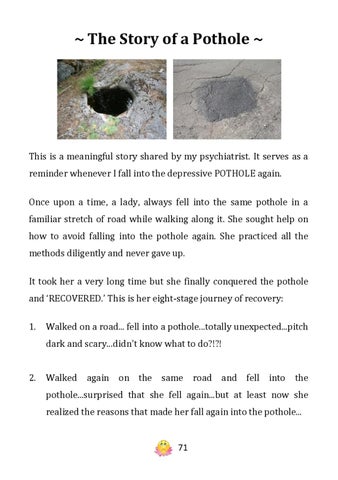 This is a meaningful story shared by my psychiatrist. It serves as a reminder whenever I fall into the depressive POTHOLE again. Once upon a time, a lady, always fell into the same pothole in a familiar stretch of road while walking along it. She sought help on how to avoid falling into the pothole again. She practiced all the methods diligently and never gave up. It took her a very long time but she finally conquered the pothole and ‘RECOVERED.’ This is her eight-stage journey of recovery: 1.