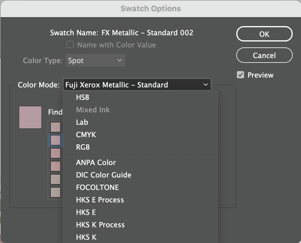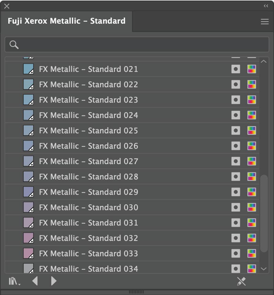 We can supply you the swatch library files for you to install called; ‘Fuji Xerox Metallic - Standard.ase’ and ‘Fuji Xerox Gold Metallic - Standard.ase’.