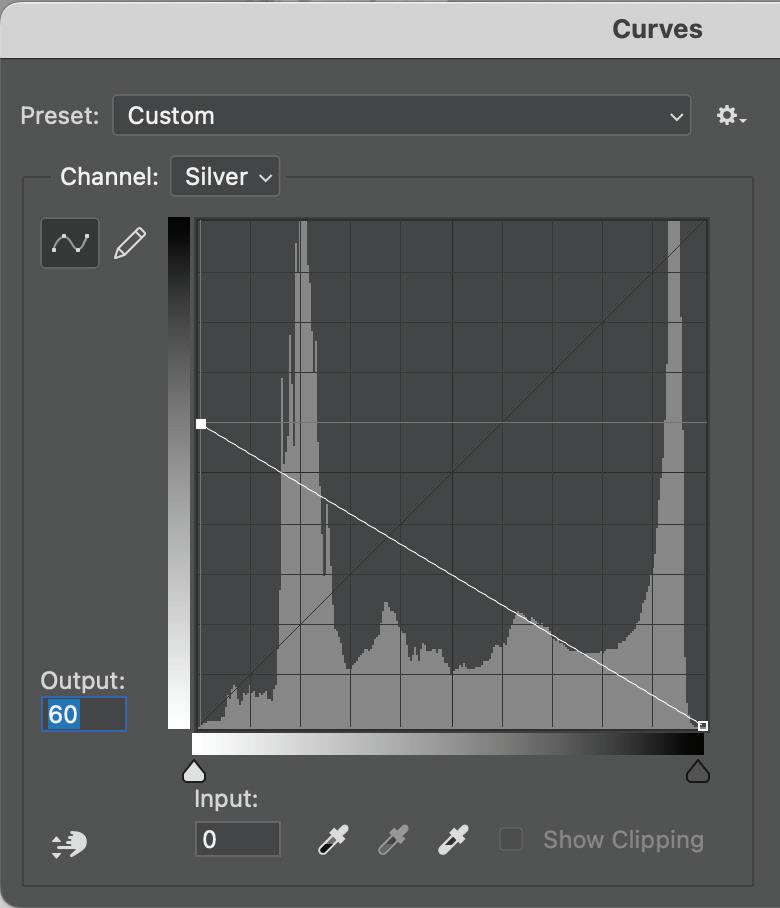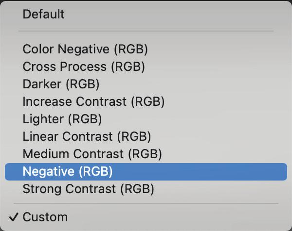 5. Select negative (RGB) curve from the pre-sets and adjust the input and output values as required.