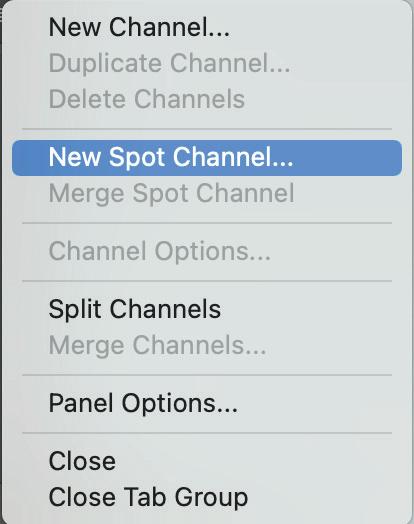 1. Open your image in Photoshop. From the Channel drop down menu, select New Spot Channel and name it Silver (with a capital ‘s’). For visual reference, make the colour 20C 10M 10Y 10K and Solidity 40% then select OK.