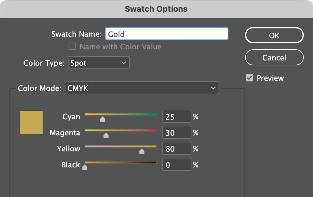 CMYK Check Overprint Fill - Attributes panelFor Gold or Silver ink, your colour swatch should be set up as a spot colour with the following reccomended values and rename to ‘Gold’ or ‘Silver’ with a capital letter at the start: