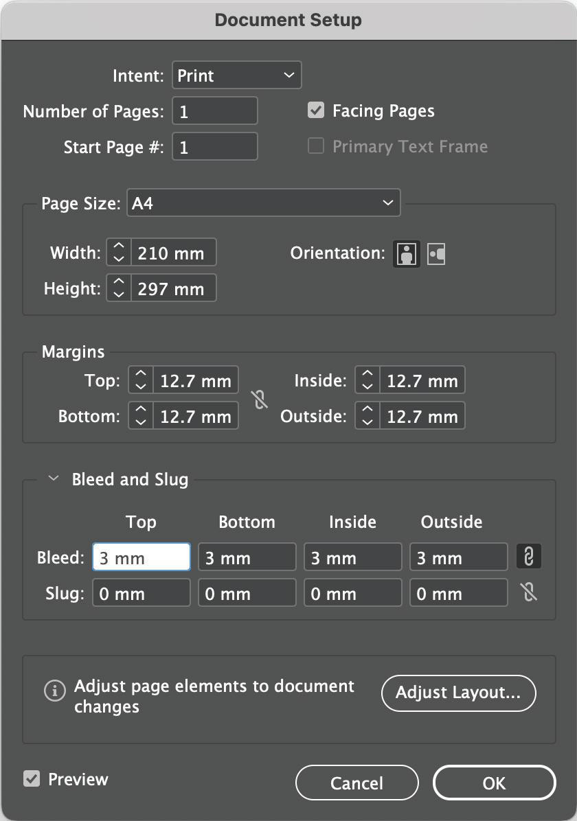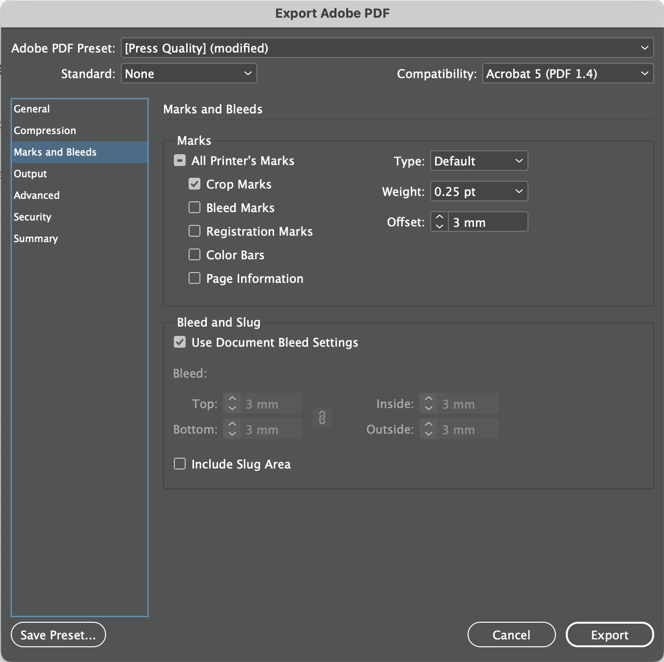 Make sure to change the default ‘offset’ value to the size of your bleed area (ie. 3mm), to ensure the cropmarks don’t intersect with your bleed area.
