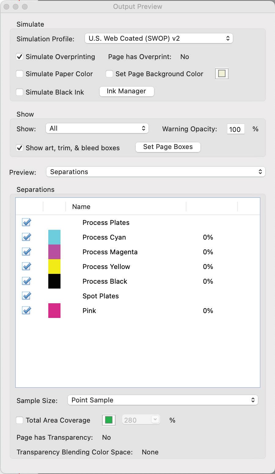 Untick pink and this colour will turn off in your PDF document so you can also check where ‘Pink’ is or isn’t in your file.