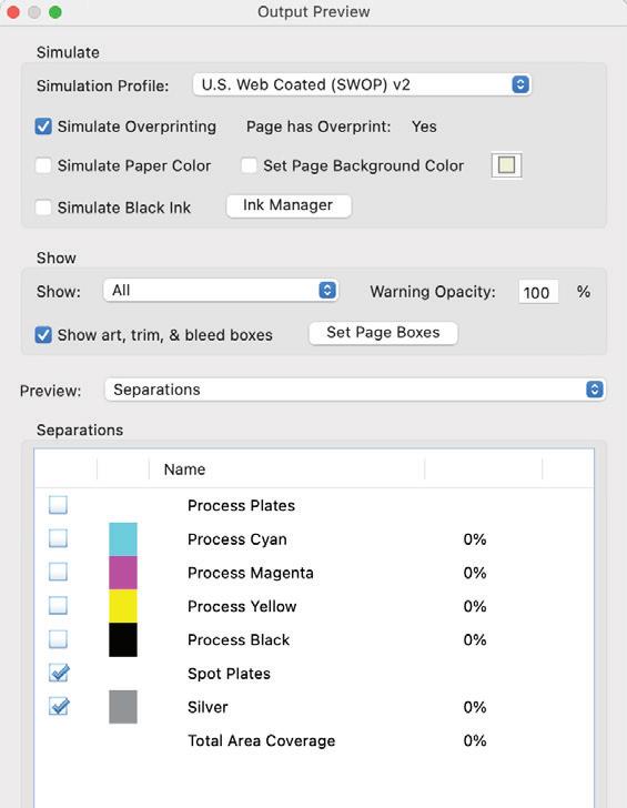 7. Check your file once you’ve exported to PDF and use Adobe Acrobat to check that the silver underlay has been set up. Open Output Preview window and check the separations. It should show CMYK and the silver spot colour in your image. Done!