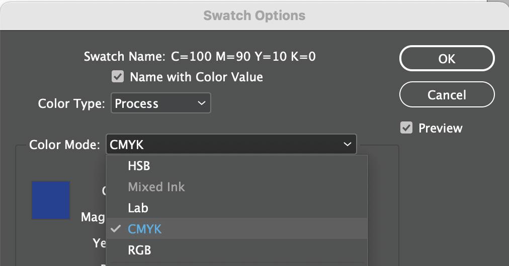 Colours within the file - check through your ‘Swatches’ Panel to ensure all colours are set up in CMYK or Spot. Icons that indicate the swatch used is RGB need to be edited by double- clicking on the colour.