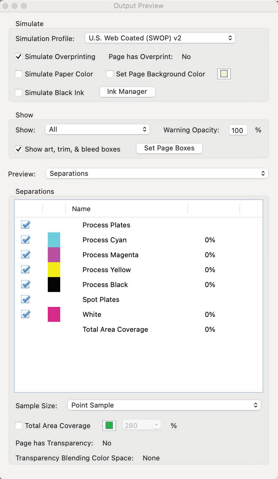 Untick white and this colour will turn off in your PDF document so you can also check where ‘White’ is or isn’t in your file.