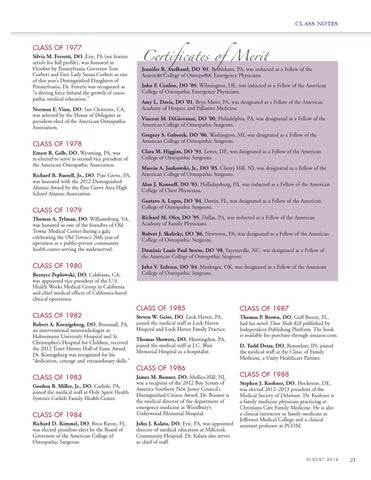 CLASS OF 1977 Silvia M. Ferretti, DO, Erie, PA (see feature article for full profile), was honored in October by Pennsylvania Governor Tom Corbett and First Lady Susan Corbett as one of this year’s Distinguished Daughters of Pennsylvania. Dr. Ferretti was recognized as “a driving force behind the growth of osteopathic medical education.” Norman E. Vinn, DO, San Clemente, CA, was selected by the House of Delegates as president-elect of the American Osteopathic Association.