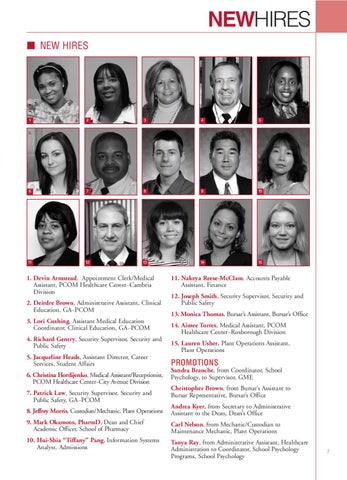 1. Devin Armstead, Appointment Clerk/Medical Assistant, PCOM Healthcare Center–Cambria Division 2. Deirdre Brown, Administrative Assistant, Clinical Education, GA–PCOM 3. Lori Cushing, Assistant Medical Education Coordinator, Clinical Education, GA–PCOM 4. Richard Gentry, Security Supervisor, Security and Public Safety 5. Jacqueline Heads, Assistant Director, Career Services, Student Affairs 6. Christina Hordijenko, Medical Assistant/Receptionist, PCOM Healthcare Center–City Avenue Division 7. Patrick Law, Security Supervisor, Security and Public Safety, GA–PCOM