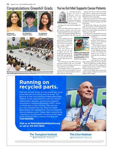 You’ve Got Mail Supports Cancer Patients At Ursuline Academy, Together with CLF, one of You’ve Got Mail’s where the motto is major projects is writing notes for the Jordan “Serviam,” Latin for Spieth-sponsored Under Armour backpacks “I will serve,” it only distributed across the entire globe. With each note, You’ve Got Mail includes makes sense that students would dedicate a $2 bill, which Leslie describes as the perfect MADDIE STOUT themselves to helping encapsulation of both the foundation and club’s their community. joint message. The biggest club at the school exemplifies this “It’s kind of like a little sign of good luck, perfectly. which fits the theme of this unexpected joy,” You’ve Got Mail, which has attracted over Leslie said. “Our message is consistently that 200 members, supports teens with cancer you are loved, which spreads across all areas of through personalized notes of encouragement. influence, no matter what.” Since Wood and Long’s graduation two years Class of 2019 graduates Marleigh Wood and Lucy Long founded the club when they were ago, the club has consistently grown and spread in school. its influence. Long originally had the Incoming You’ve Got Mail idea for You’ve Got Mail after president Natalie Marina is noticing that teens with cancer aiming for more involvement, often received less attention projects, and expansion. “We’re trying to start the than younger children or adults with the disease. same club at Jesuit, which is “The main purpose of really exciting,” she said. “And we were talking about doing a creating the club was just toy drive and bringing more to support the teens who Students create themed cards needed supporting because we people in since we have so for the holidays and patients’ learned they were getting left many girls who are willing to birthdays to give them a out,” Long said. “We wanted personalized feel. (PHOTOS: help.” everyone to feel that they were COURTESY OF NATALIE MARINA) Members of the club have valued.” found that You’ve Got Mail After discussing the idea, Wood and Long helps themselves along with the cancer patients. “You’ve Got Mail means spreading all kinds approached Annette Leslie, who co-founded the Carson Leslie Foundation after her son of positivity,” Wood said. “It’s something that Carson died from cancer in 2010. people can always come to if they are having a The foundation’s mission of raising funds for bad day and spread joy all around.” research toward a cure for pediatric cancer and Summer intern Maddie Stout, co-editor of her supporting teens fighting the disease made it a campus newspaper, will begin her senior year at The logical choice for a partnership. Hockaday School in August.