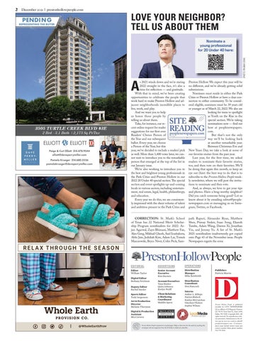 Preston Hollow. We expect this year will be no different, and we’re already getting solid submissions. Nominees must reside in either the Park Cities or Preston Hollow or have a clear connection to either community. To be considered eligible, nominees must be 39 years old or younger as of March 22, 2022. We also are looking for teens to spotlight as Youth on the Rise in the special section. We’re taking nominations now — find out how at peoplenewspapers. com. But that’s not the only way we’ll be looking back at another remarkable year. Between Christmas Eve and New Years Day, we take a look at some of our favorite stories from the past year. Last year, for the first time, we asked readers to nominate their favorite stories, too, and then vote on their favorites. We’ll be doing that again this month, so keep an eye out (hint: the best way to do that is to subscribe to the Preston Hollow People weekly newsletter, where we will post the invitations to nominate and then vote. And, as always, we love to get your tips and photos. Have a brag-worthy neighbor? Did you catch someone being good? Let us know about it by emailing editor@peoplenewspapers.com or messaging us on Instagram, Twitter, or Facebook.