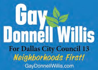 pockets any day. My focus will continue to be Neighborhoods First. I do not have any conflicts of interest and I am a consensus builder who will gets things done. I’m asking for your vote in the run-off and if you didn’t vote for me, I hope you will reconsider your vote - I’ll listen to YOU and be YOUR voice at City Hall. Gay Donnell Willis