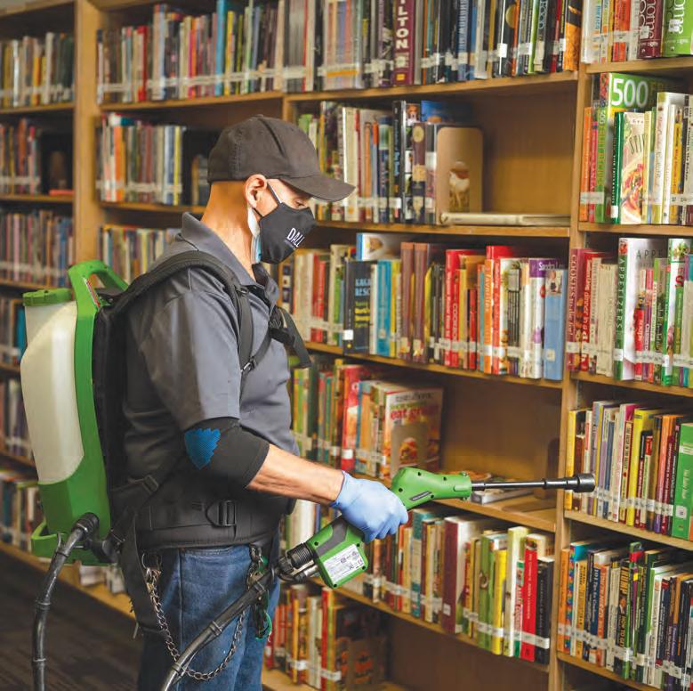 LEFT: Reporters gathered around Dallas ISD superintendent Michael Hinojosa during a visit to the newly-opened Prestonwood Montessori at E.D. Walker on the first day of school. (PHOTO: BETHANY ERICKSON) AT RIGHT: Dallas ISD’s COVID protocols include masking, social distancing, handwashing, and frequent cleaning and disinfecting. (PHOTOS: DALLAS ISD)