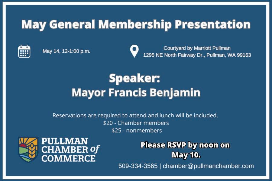 Pullman Community Update 19 MAY 2024 Ken Paulson Plumbing 1401 Countr y Club Rd • Pullman kenpaulsonplumbinginc com (509) 338-0824 OR (509)-330-0243 KENPAPP791B5 • KENPAPI990P5 Ken Paulson Plumbing Make sure your air conditioning is ready to keep up with the heat! We service, repair, replace, and install air conditioning and mini-splits. Give us a call today! Moscow Office: 217 S Main St. (208) 882-0800 Pullman Office: 405 South Grand Ave. (509) 334-0562 Lewiston Office: 325 Main St. (208) 746-7400 cbquadcities.com what worth? Each office is independently owned and operated. Search our listings HERE FOR YOU. Our experienced real estate professionals know the local market and are ready to help you. Contact us today! Jason M. Brown Designated Broker (208) 669-1690 Debbie Lawrence Managing Broker (208) 301-0108 Carrie Barker (208) 310-9799 Mark Blehm (509) 336-9935 Jacob Campfield (425) 903-2193 Stephanie Clark (509) 595-2798 Jayci Cocking (307) 670-1147 Dan Colvin (360) 774-0082 Eve Fortenbery (208) 301-8698 Patti Green-Kent (509) 595-3740 Dawson Dugger (509) 595-1108 Melissa Harrison (509) 710-5463 Kim Kirsch (509) 592-8045 Darl Roberts (509) 432-1642 Fattima Rowland (208) 310-0204 Mick Nazerali (206) 794-7860 Siua Musika (425) 757-8212 Ashley Alred (509) 338-5306 Kim Brickey (509) 595-3536 Smoking our own brisket and pork. 200 E MAIN, PULLMAN • 332-6566 Minors are welcome until 8 pm Rico’s is a proud woman-owned business. Coupon expires 5/31/2024. One coupon per table per visit. Coupon can not be combined or used with any other sale or special. Not valid for take-out. Check out something new at your favorite place! Support Local Businesses! Lesser Value for Half Price During construction, use our back door o the Cougar Plaza parking lot!