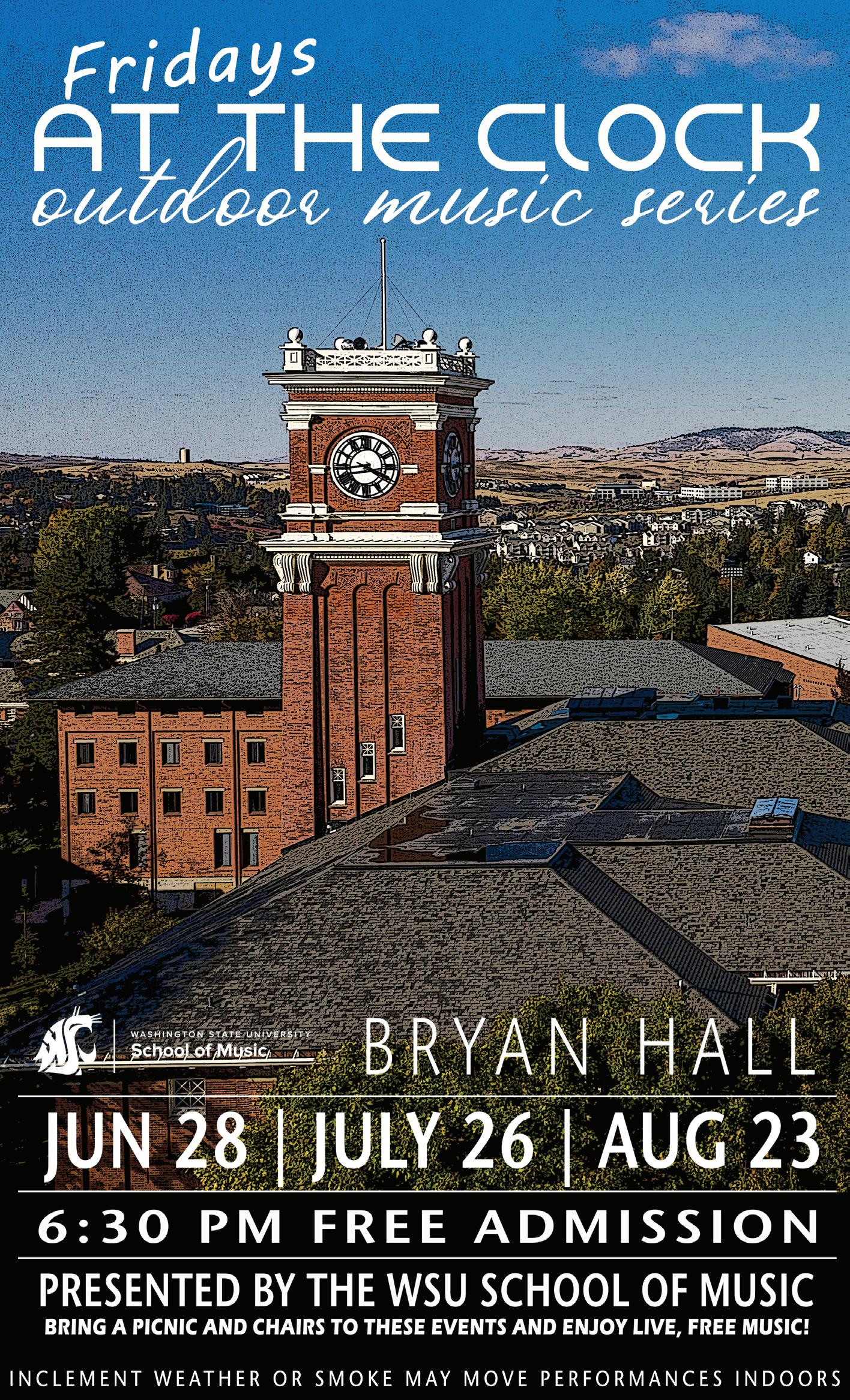 The Fridays at the Clock! concerts are held on the lawn between Bryan Hall and Holland Library. Community members are invited to bring their blankets and lawn chairs for evenings of family-friendly music from WSU faculty, Cougar Summer Music Camp students and more.